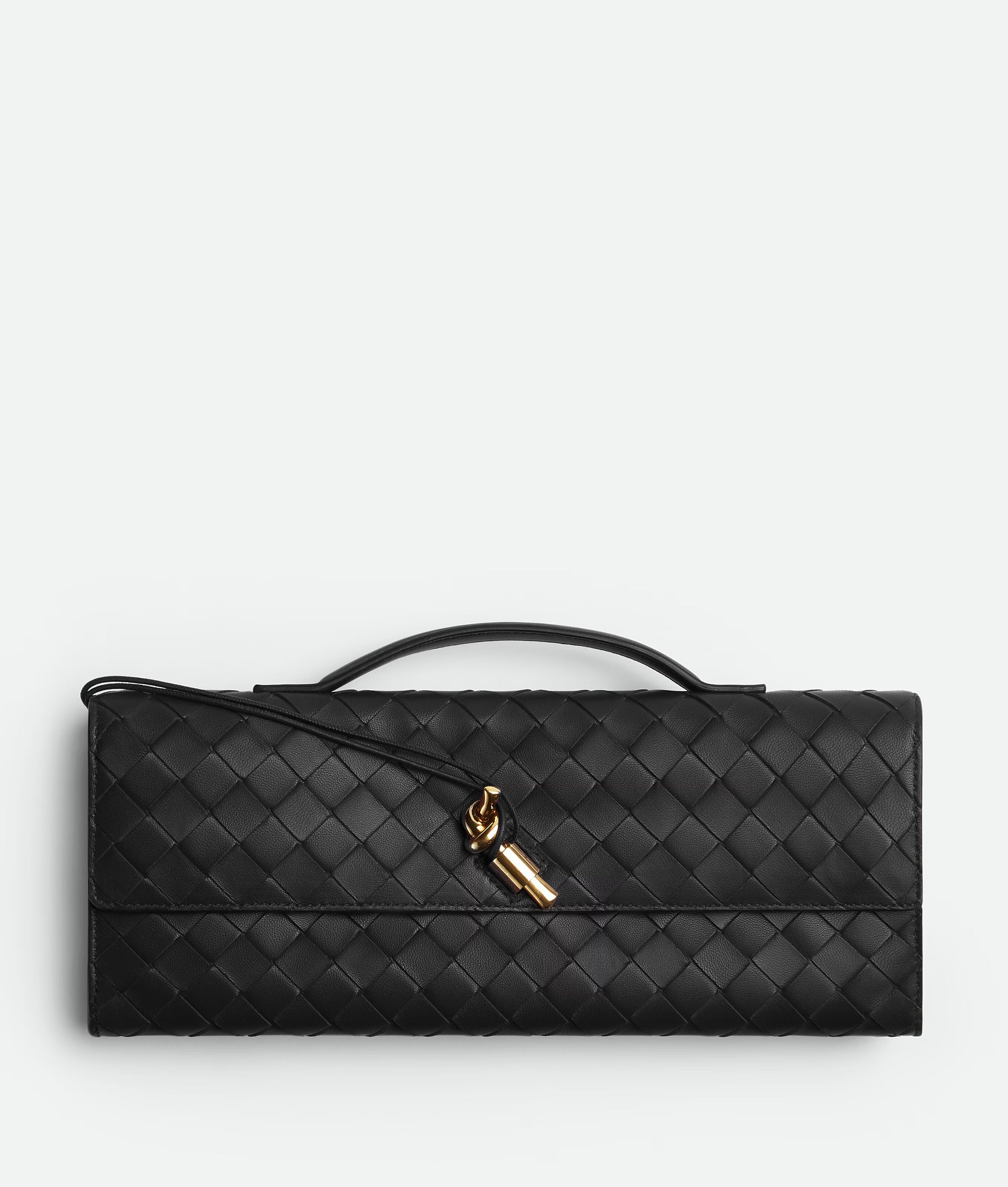 Top handle clutch in supple Intrecciato leather with signature knot closure.