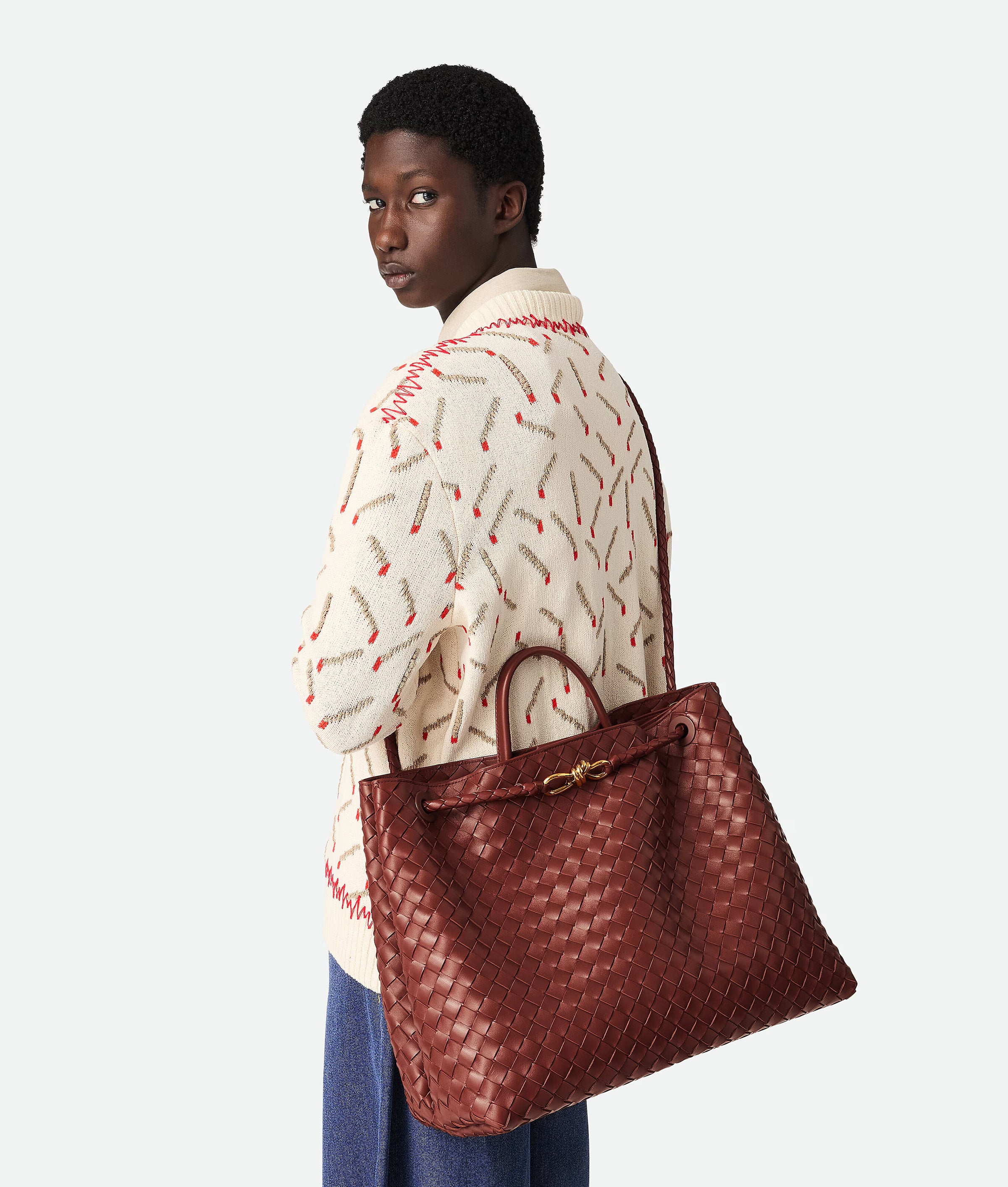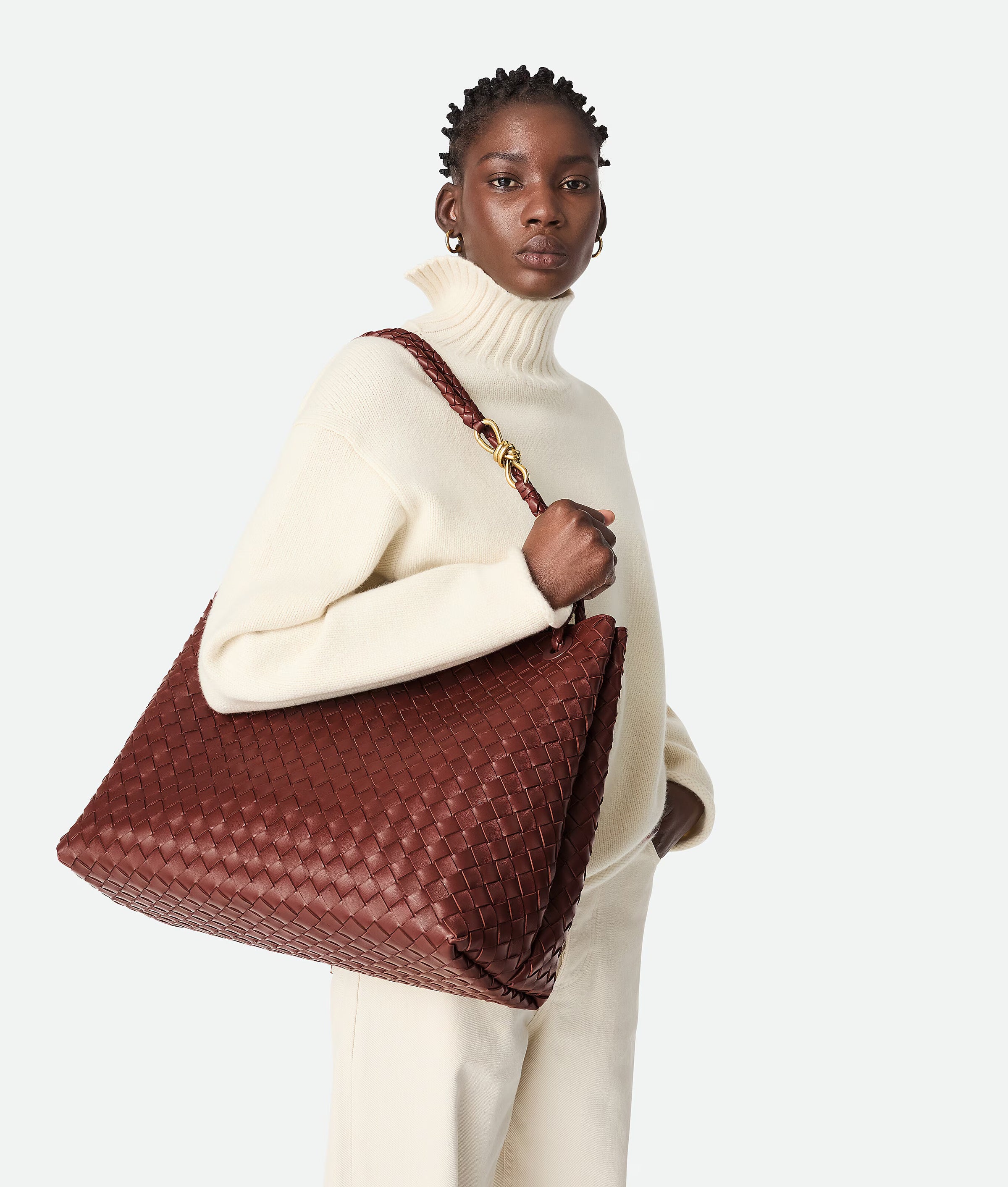 Top handle bag in supple Intrecciato leather with signature knot detail and sliding cross-body strap.