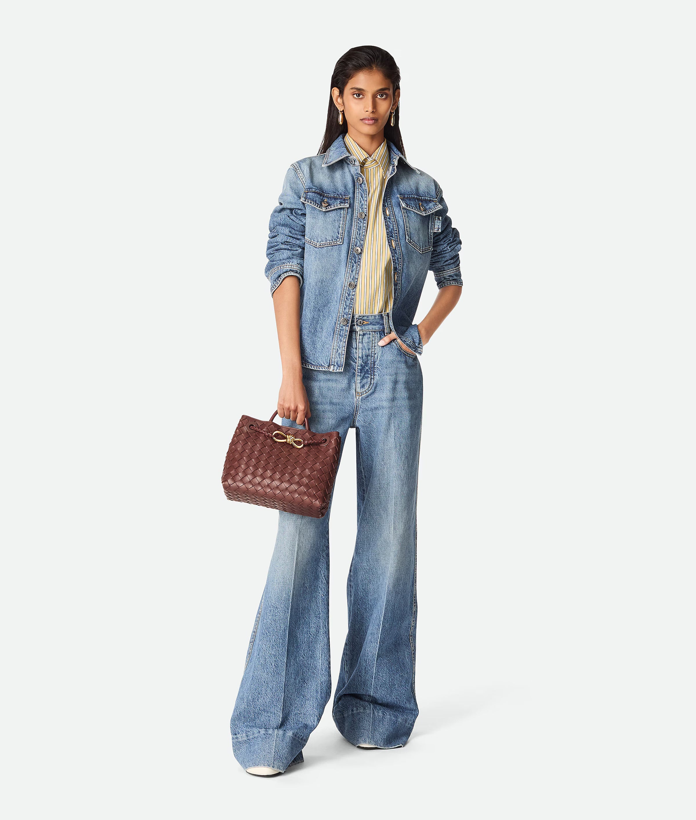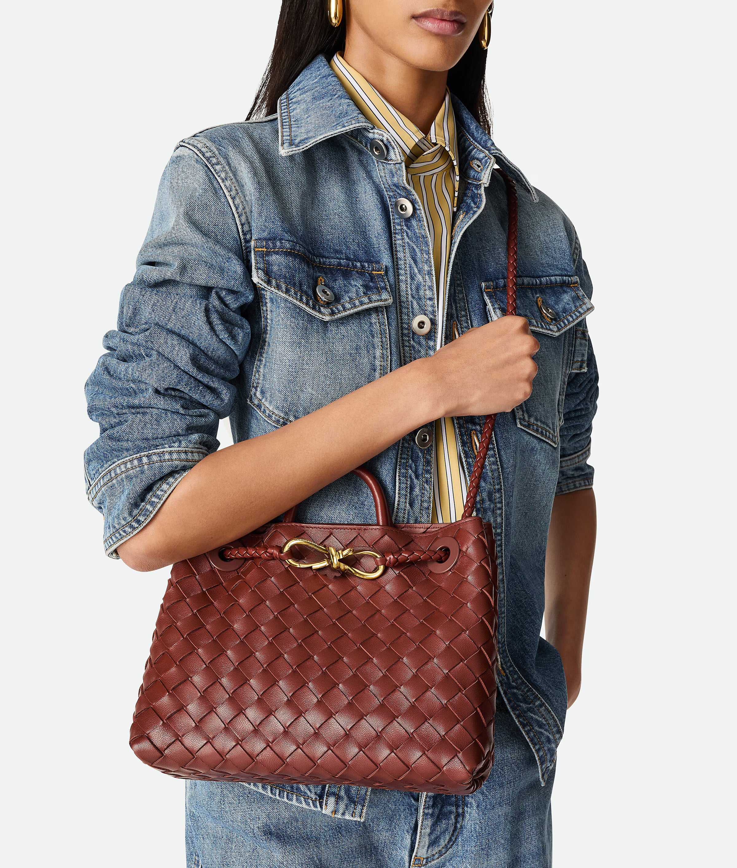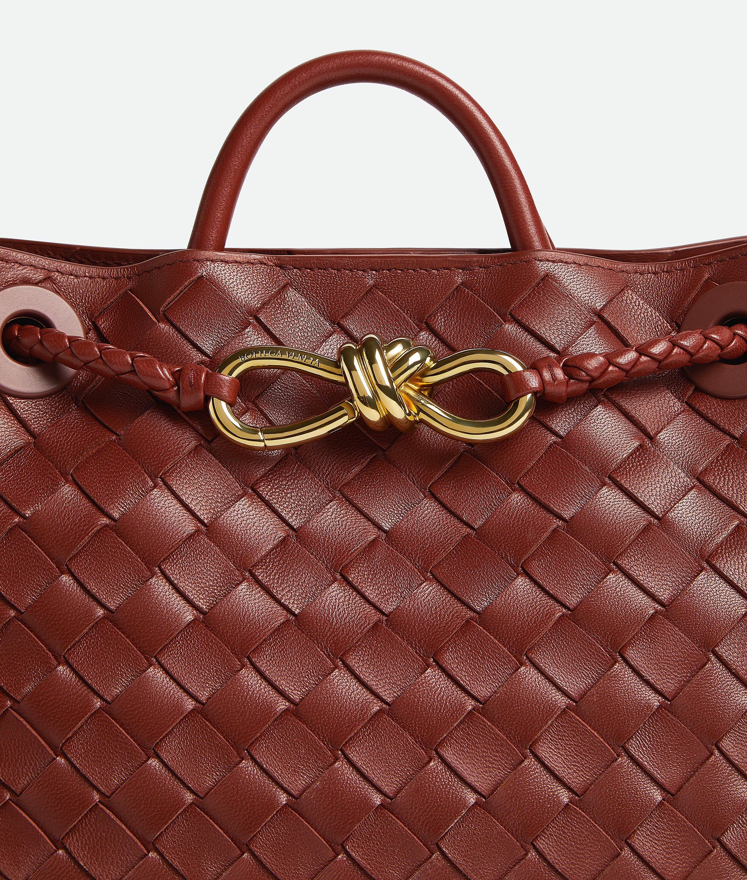 Top handle bag in supple Intrecciato leather with signature knot detail and sliding strap.