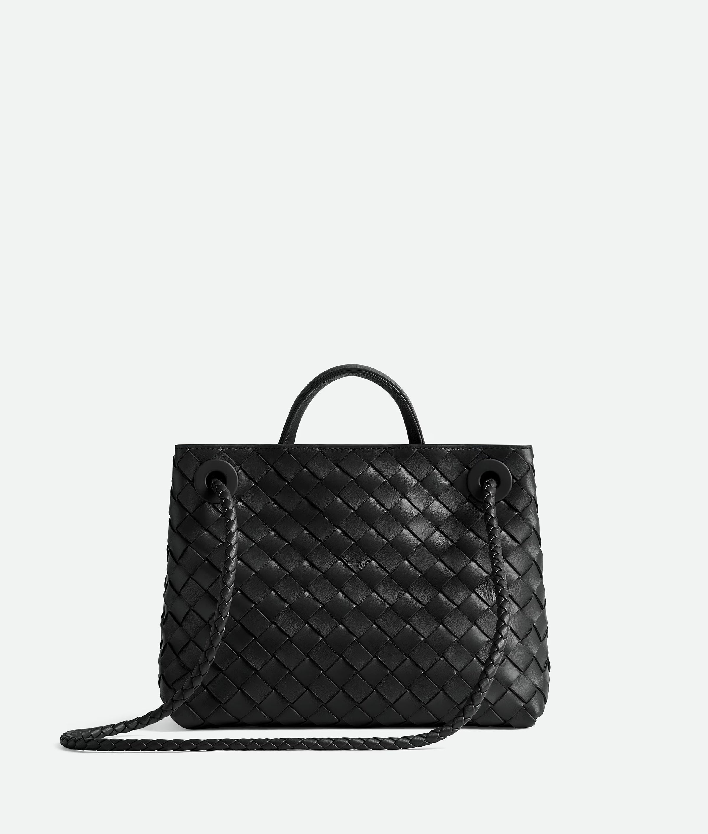 Top handle bag in supple Intrecciato leather with signature knot detail and sliding strap.
