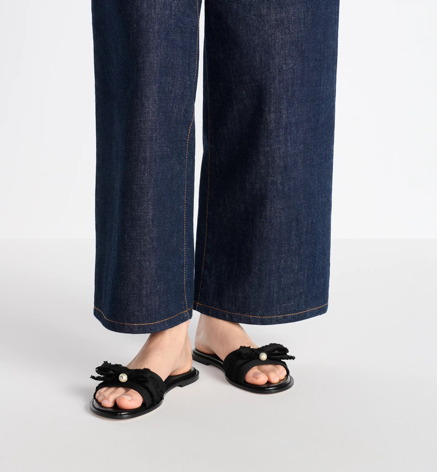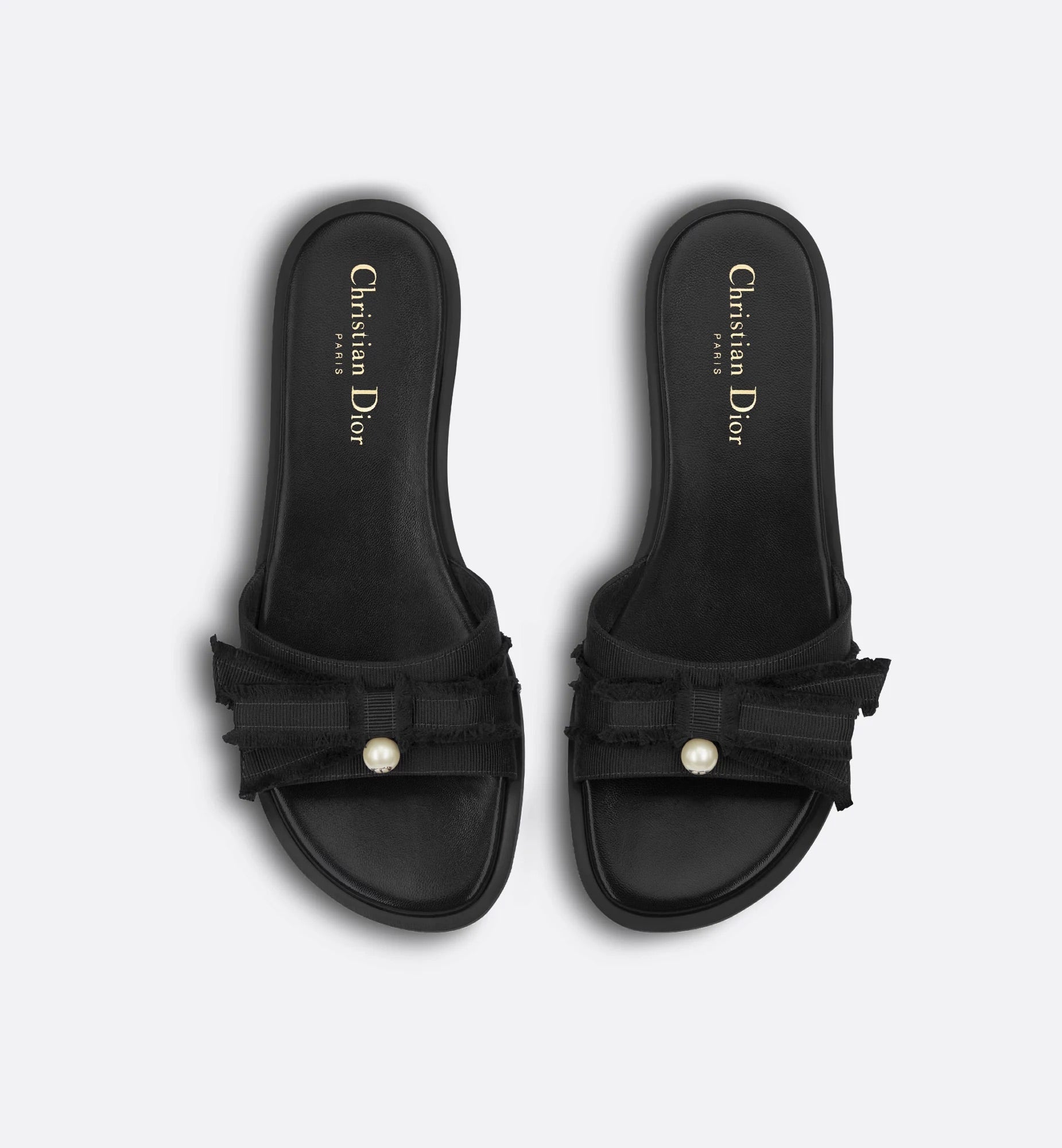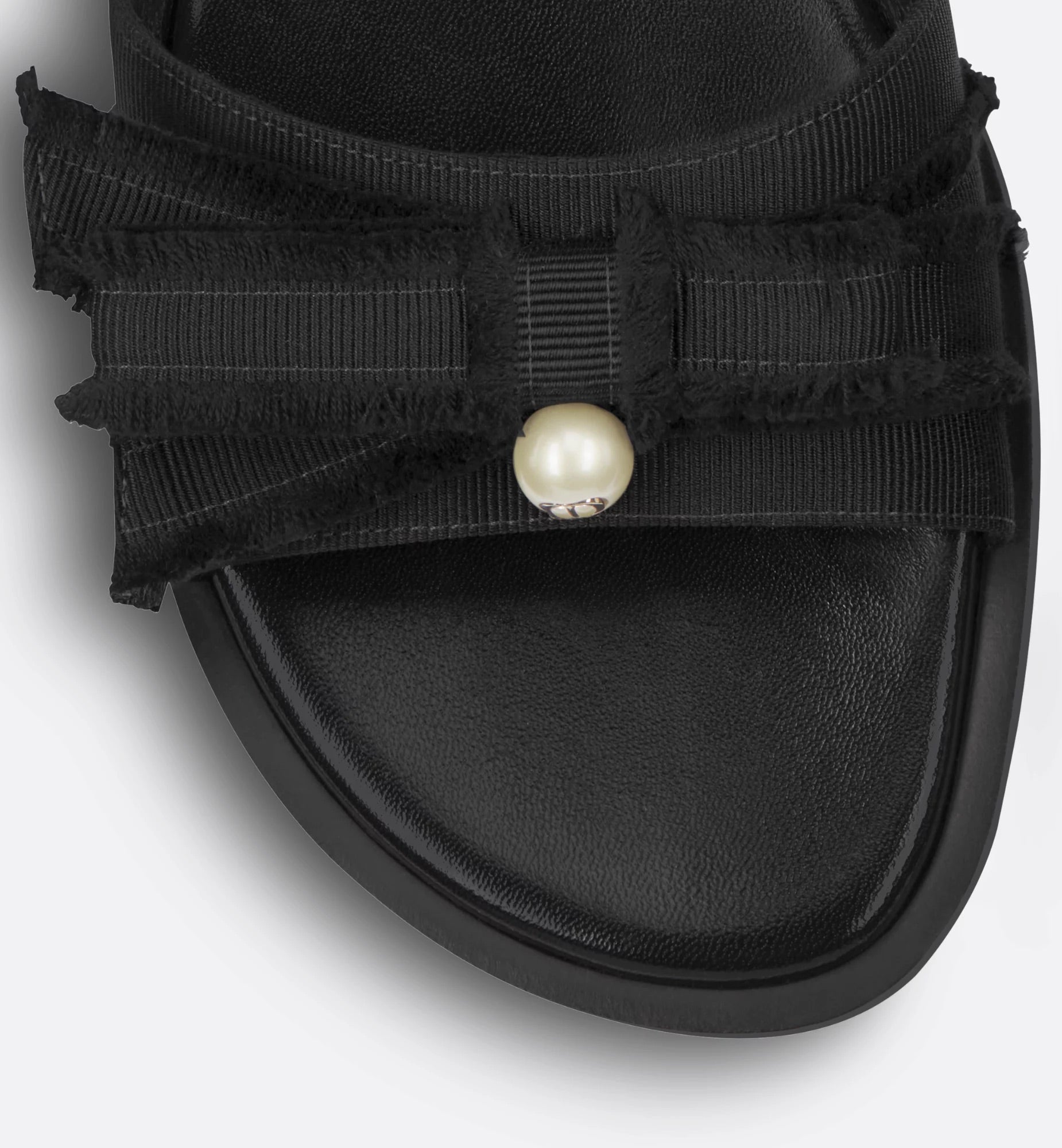 The Adiorable slide is modern and elegant. The black fringed grosgrain upper features a deconstructed bow on the front embellished with a white CD resin pearl inspired by the iconic Dior Tribales earrings. The shoe will lend a refined touch to any of the season's relaxed looks.