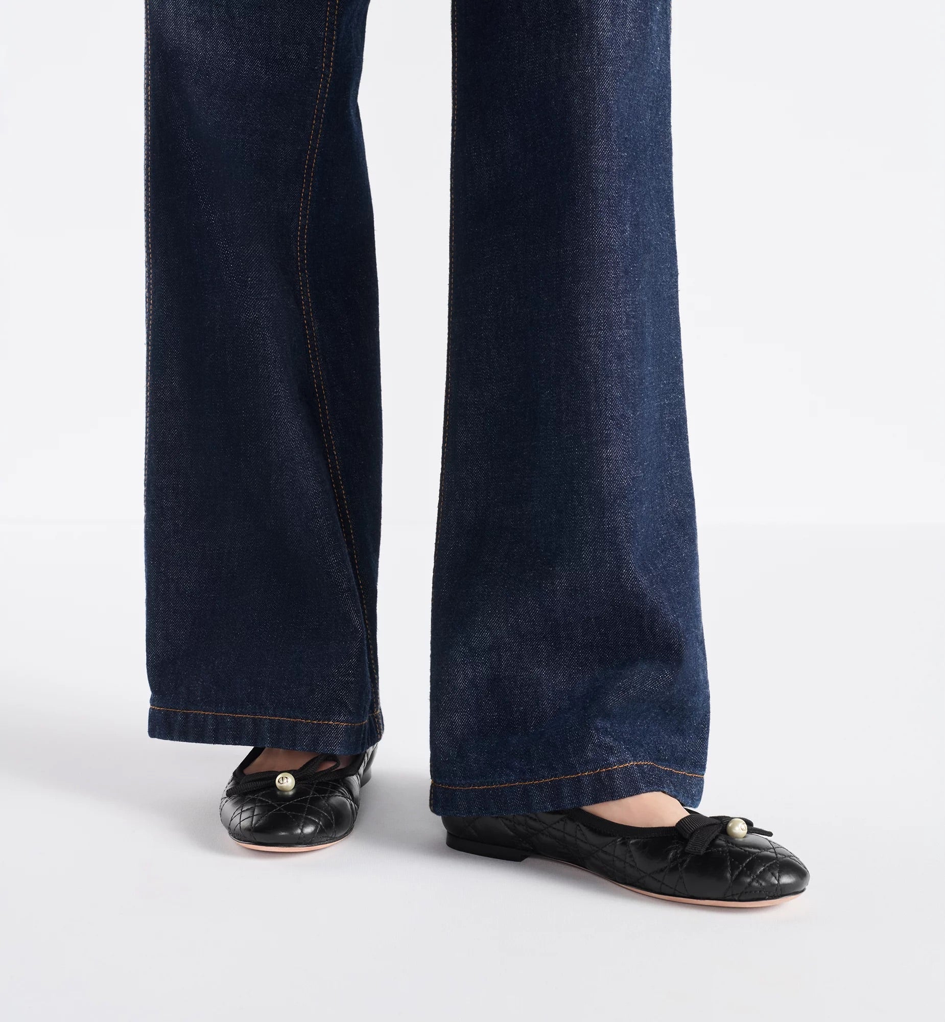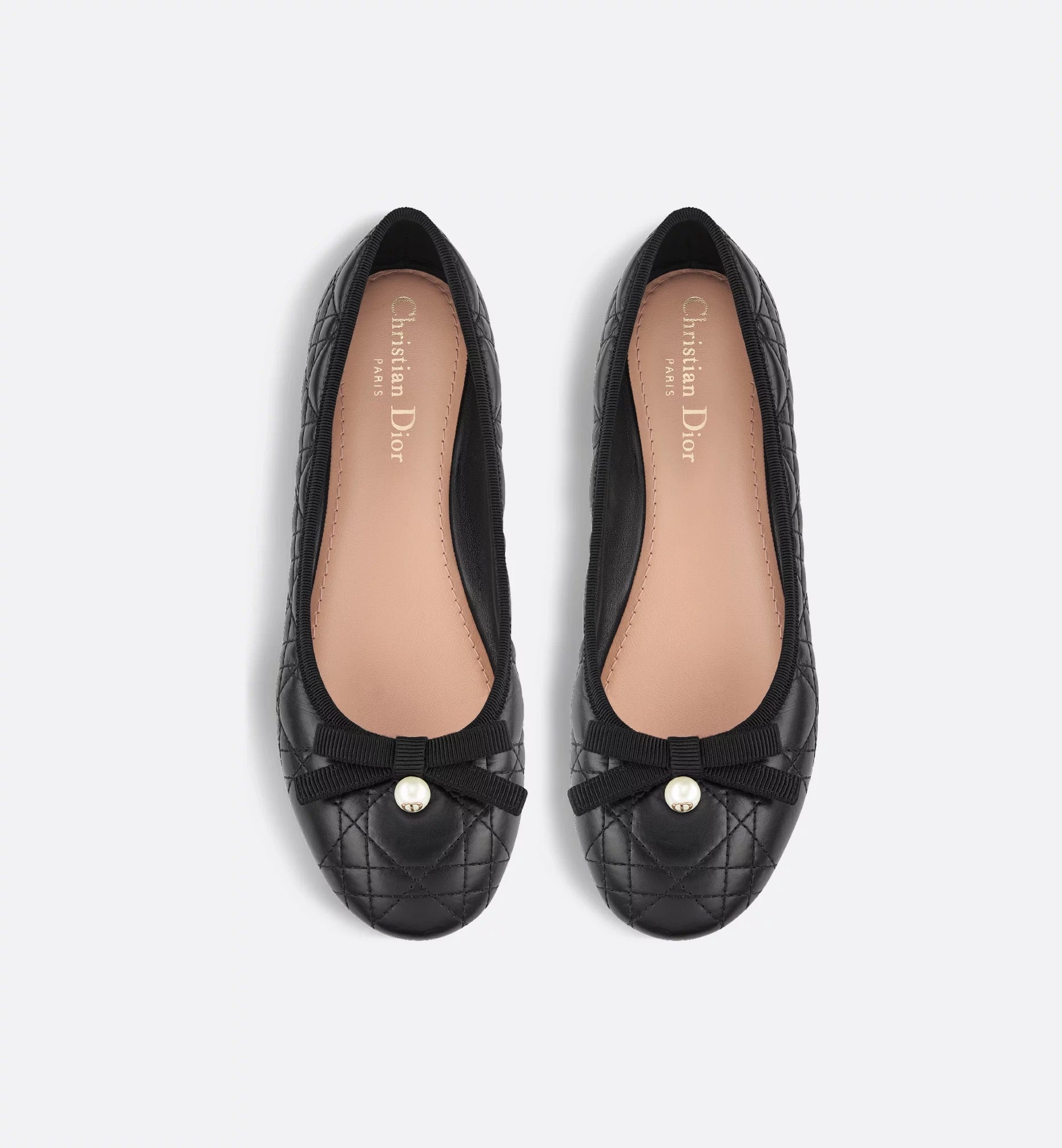 The Dior Ballet flat revisits a timeless pattern with elements of House couture. Crafted in black quilted calfskin with the Cannage motif, it is distinguished by a delicate grosgrain bow on the front adorned with a white CD resin pearl inspired by the iconic Dior Tribales earrings. Featuring a padded leather insole, the supple, comfortable ballet flat will add the finishing touch to all of the season's looks.