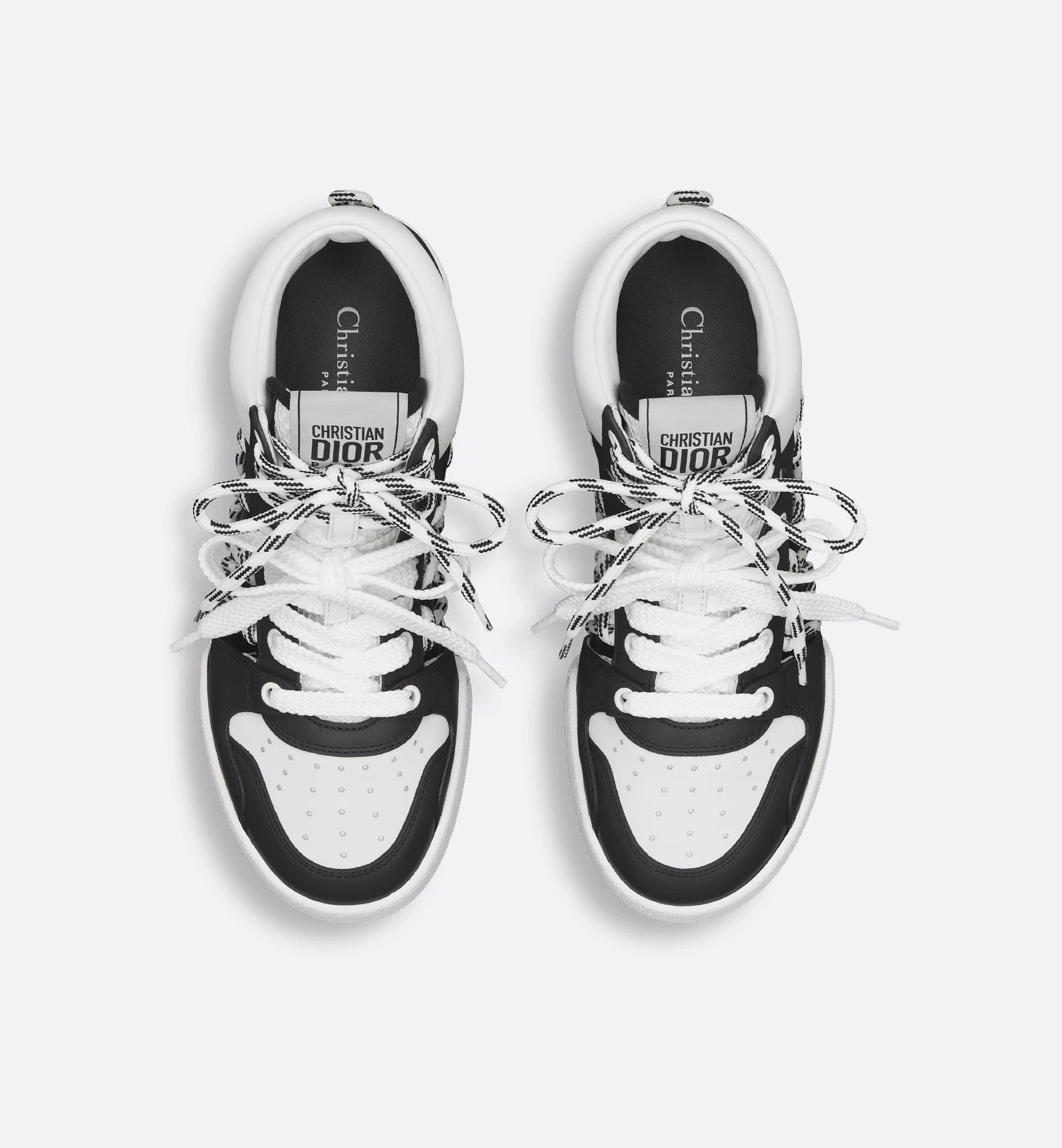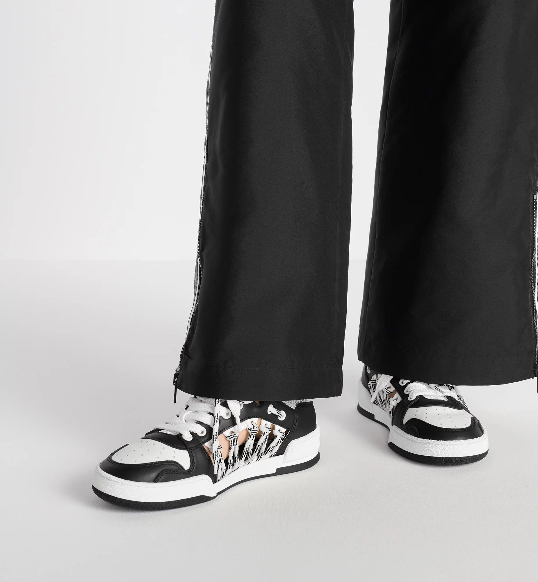 Unveiled at the Spring-Summer 2025 Ready-to-Wear Fashion Show, the season's new Dior First high-top sneaker revisits sportswear codes through the House's couture lens. The combination of black and white calfskin with white technical mesh is enhanced by side cutouts with a two-tone laced detail, echoing the double lacing on the front. The two-tone Christian Dior Paris tongue and rubber sole add a hallmark touch to the sneaker, which can be paired with any of the season's casual looks.