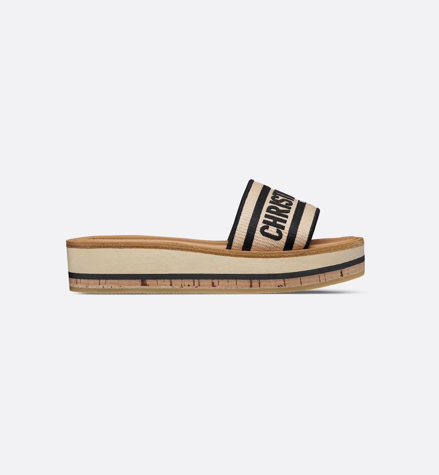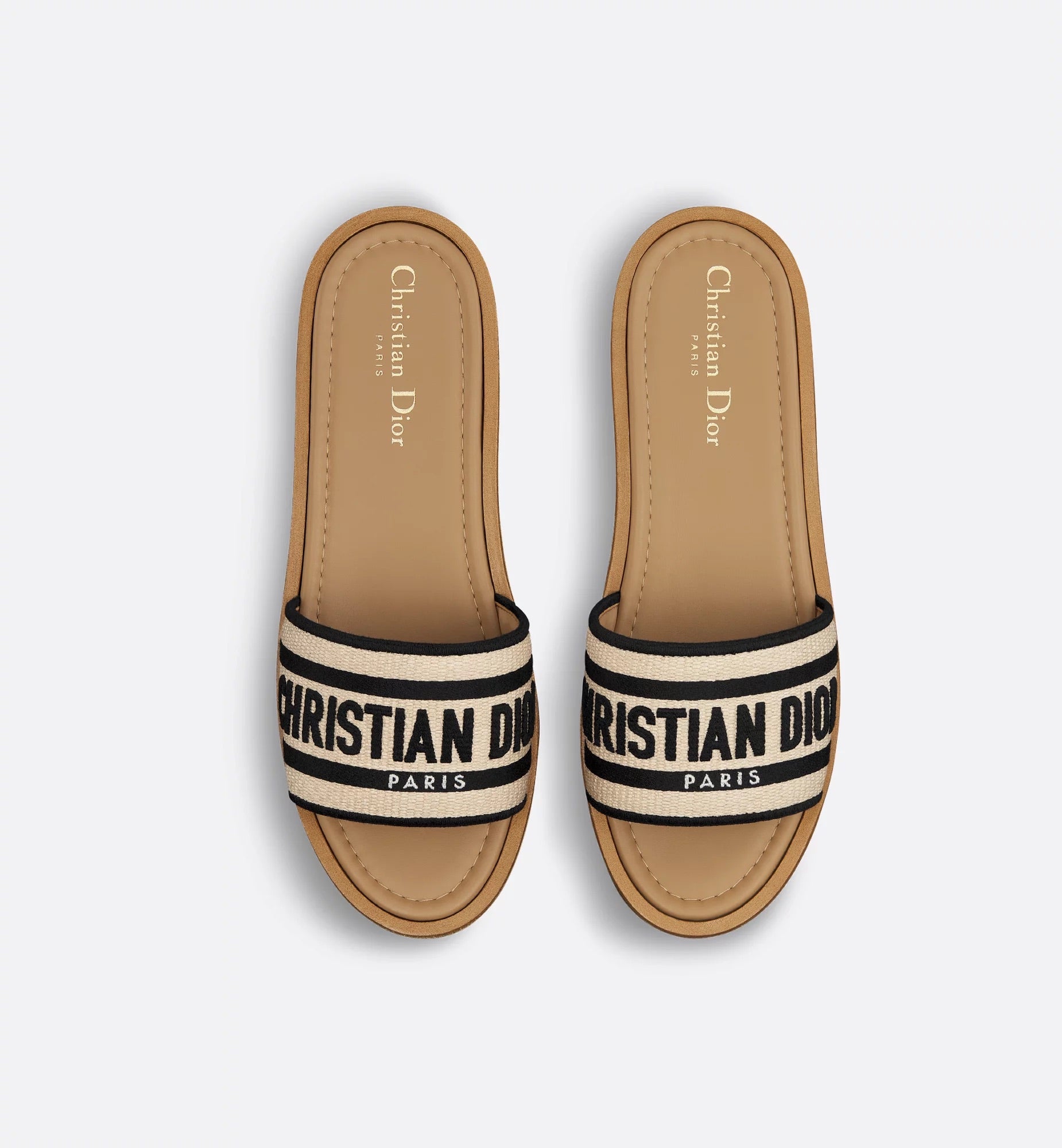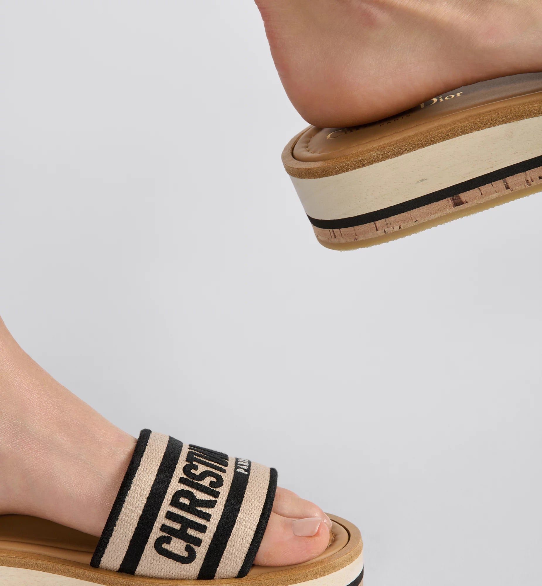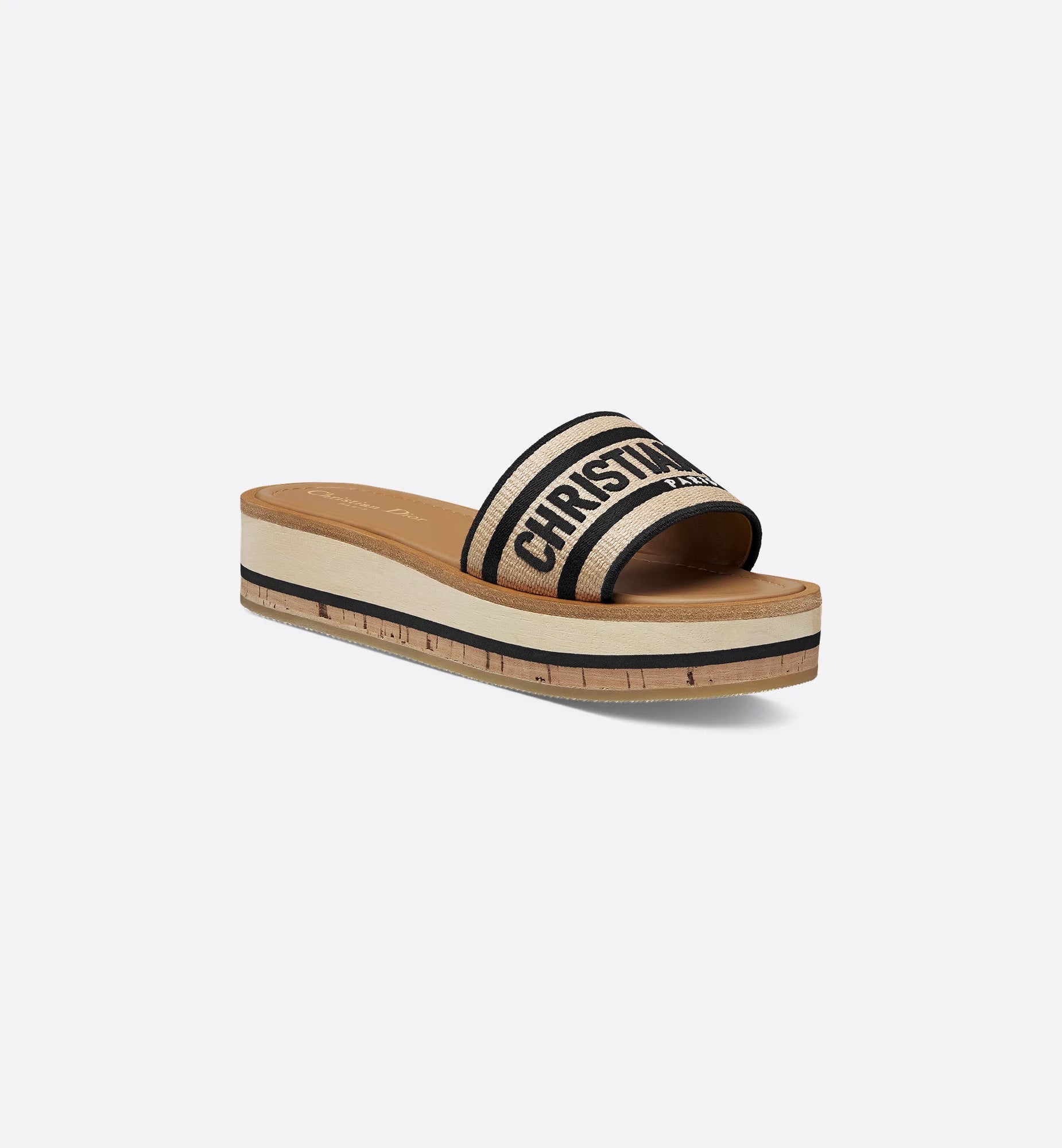New for Fall 2024, the Dway platform slide has a modern and casual look. The natural raffia and black cotton upper is embroidered with the instantly recognizable Christian Dior Paris signature. Completed by a thick sole in wood, black rubber and cork, the shoe will elevate any of the season's looks.