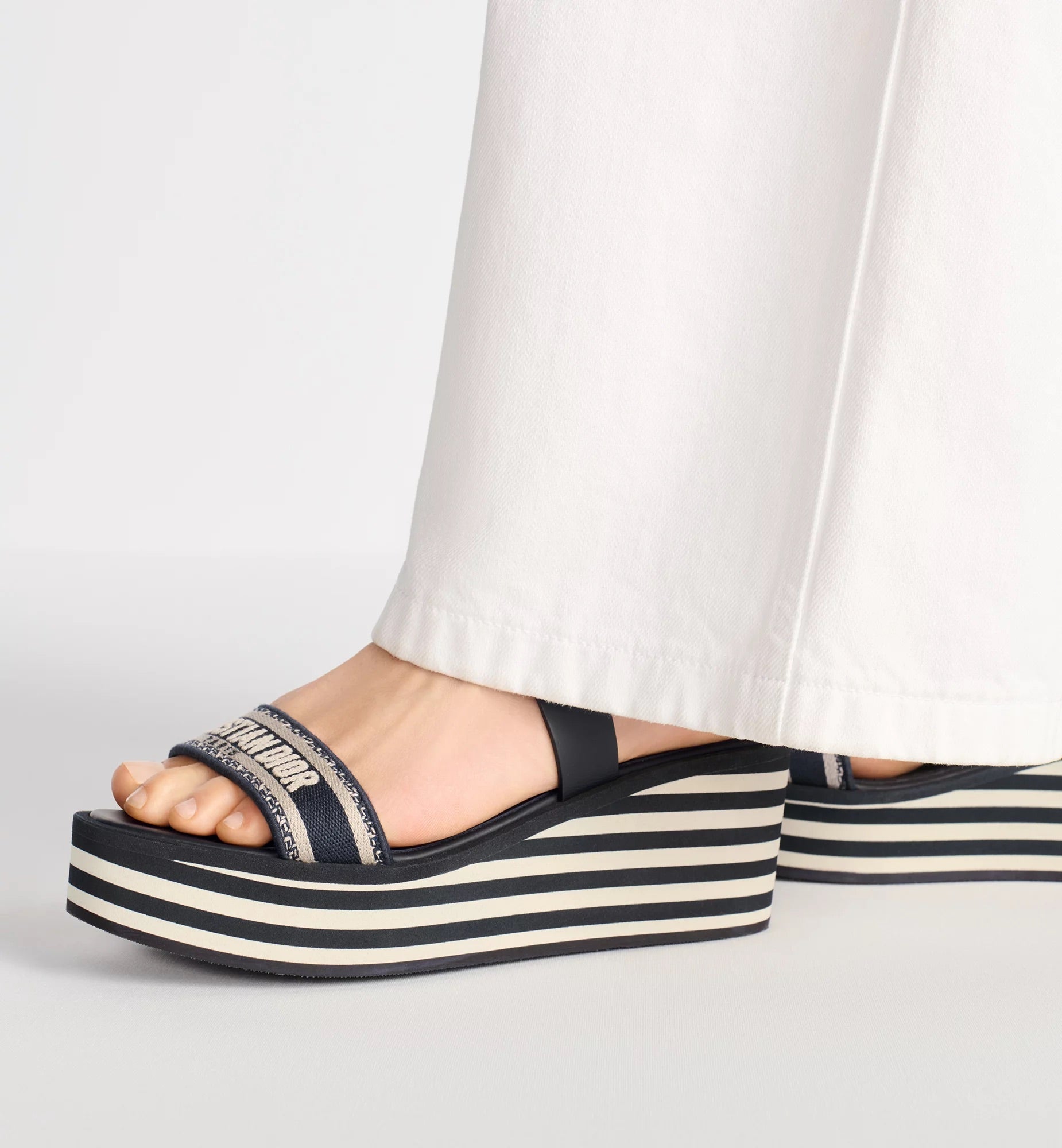 The Dway wedge sandal revisits a hallmark and timeless design. Embroidered with the Christian Dior Paris signature, the deep blue cotton upper lends an unmistakable touch, while the tonal calfskin adjustable buckled strap delicately accents the ankle. Completed by a 7-cm (3-inch) ultralightweight microcellular wedge with blue and white stripes, the shoe will elevate any of the season's looks.