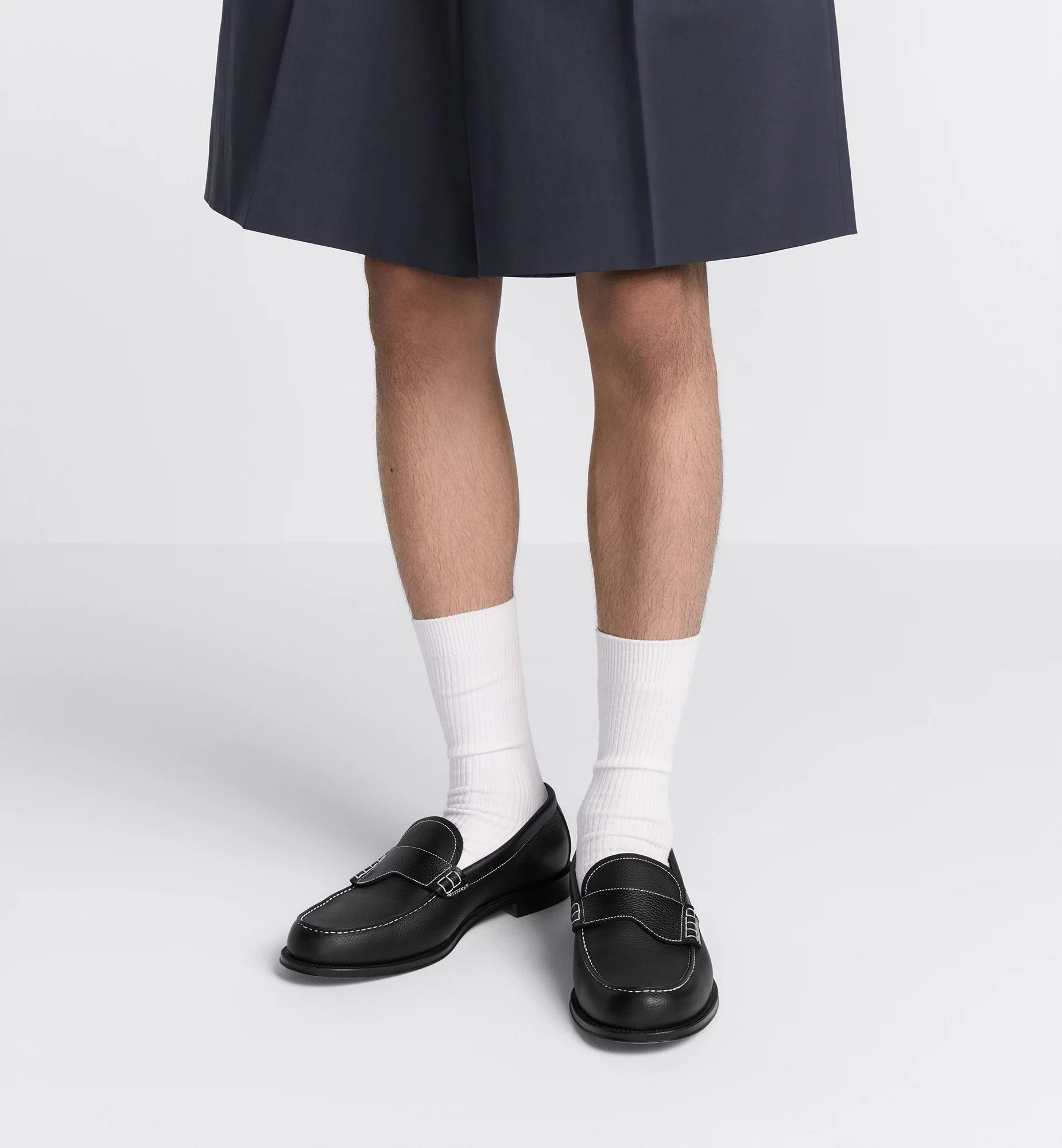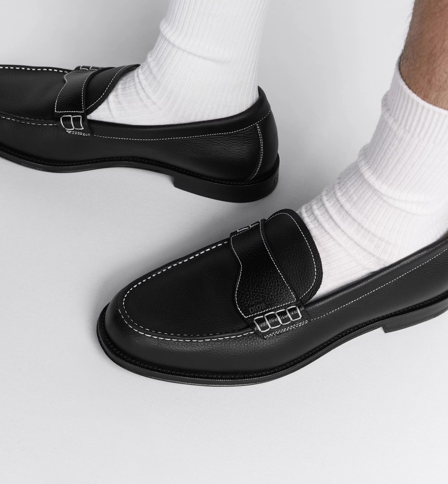 New for Fall 2024, the Dior Granville loafer presents a refined version of an urban shoe. Made in black grained calfskin with contrasting topstitching, the style is embellished with a tonal Saddle strap on the vamp. The creation is completed by a leather sole and an engraved Dior signature on the back. The shoe can be worn with any seasonal attire for an elegant and timeless look.
