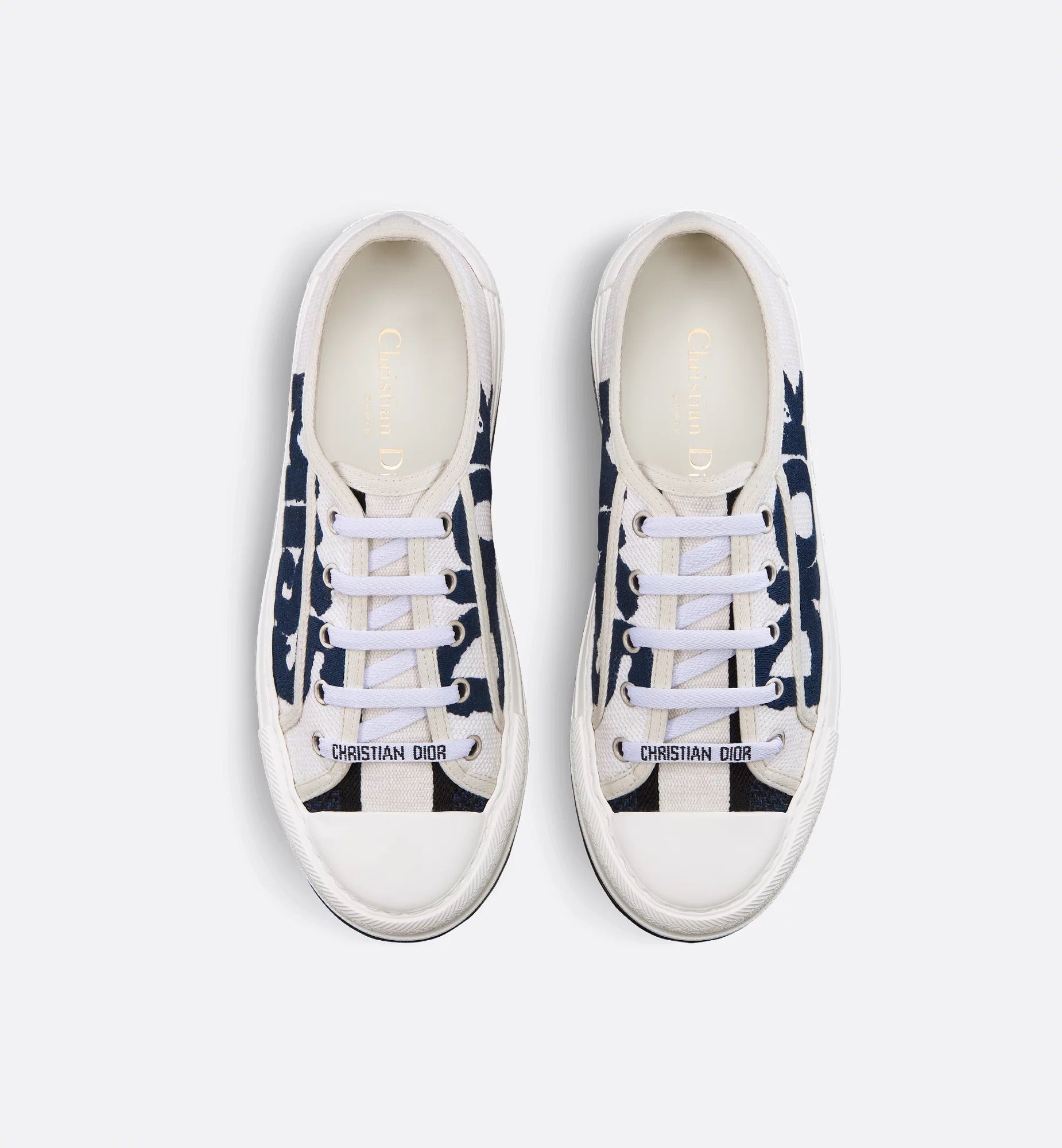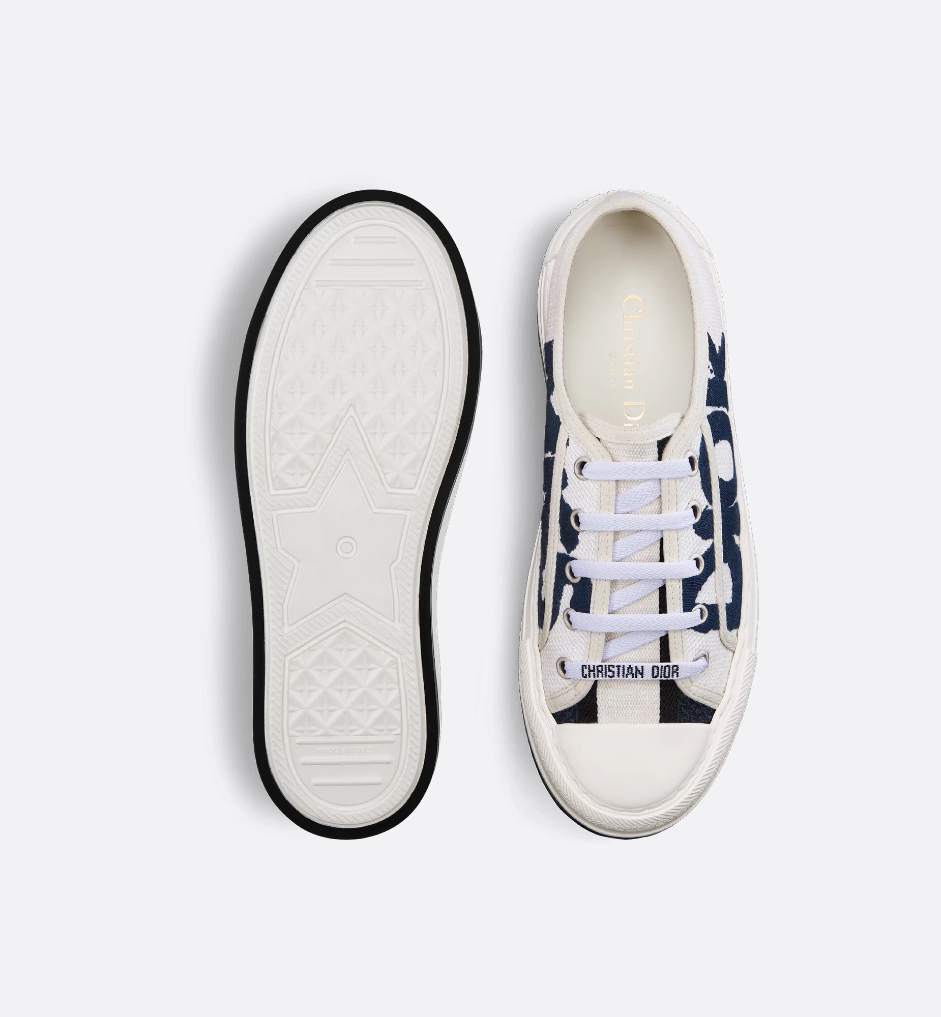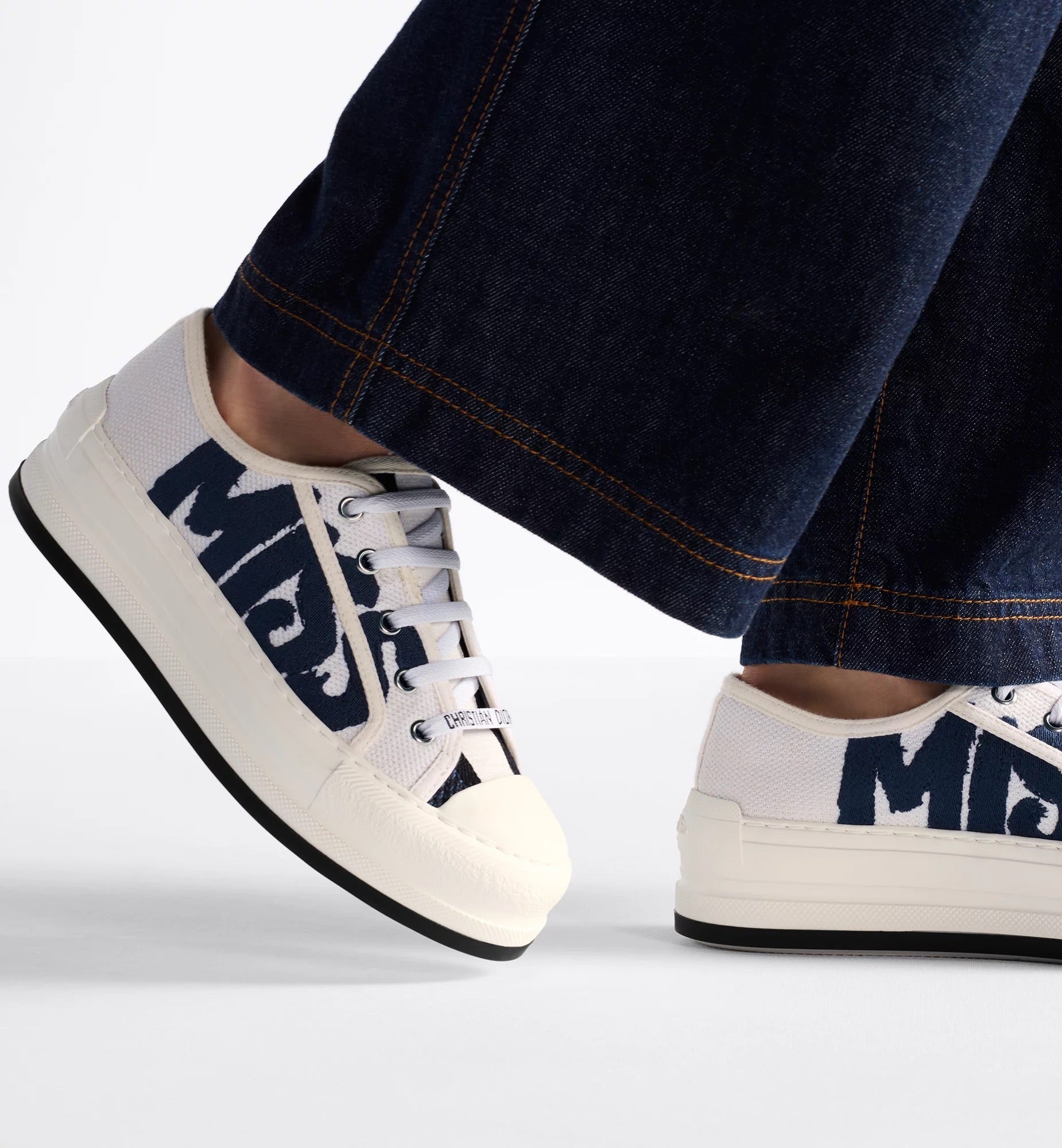 The Walk'n'Dior platform sneaker showcases the deep blue Miss Dior Graffiti motif, a nod to the 1967 debut ready-to-wear collection and a manifesto to Maria Grazia Chiuri's signature celebration of feminism. The white cotton style features a comfortable thick sole, tongue and Christian Dior laces. The sneaker will add a contemporary touch to any laid-back look and can be coordinated with other Miss Dior Graffiti creations.