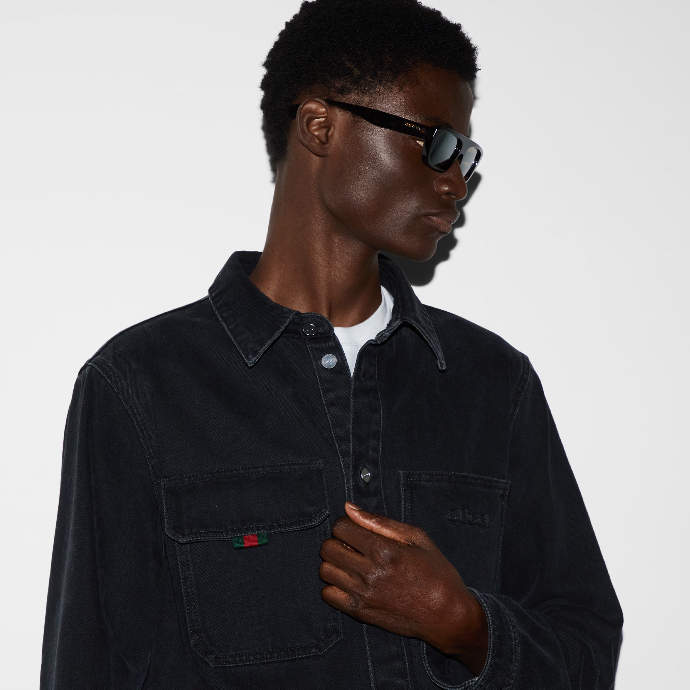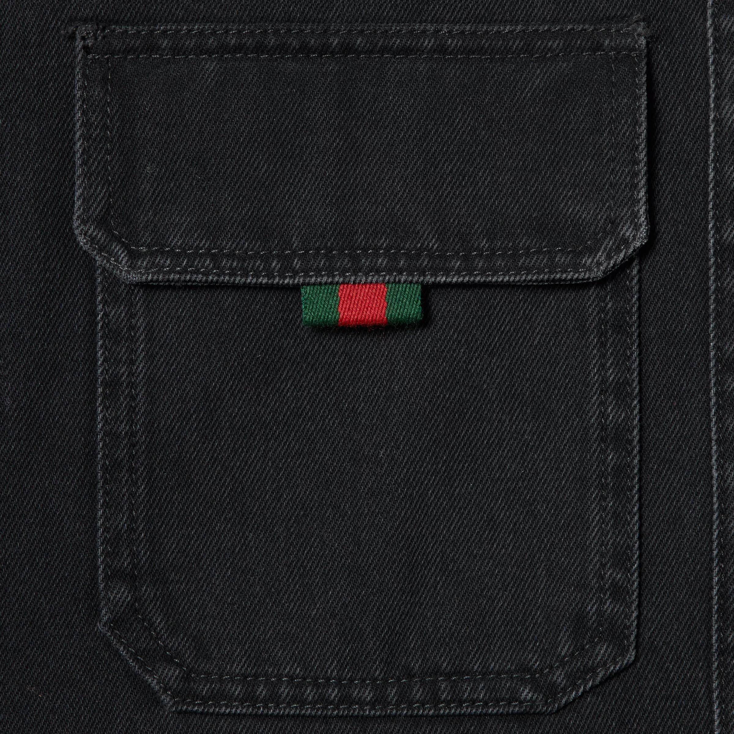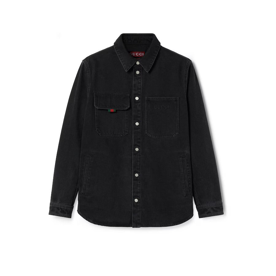 Darker color palettes usher in Pre-Fall mood with sophisticated sets that reveal complex internal constructions and subtle details behind a seemingly somber surface. This regular fit shirt is presented in a stone washed denim and enriched with a Gucci embroidery and a green and red Web loop detail.