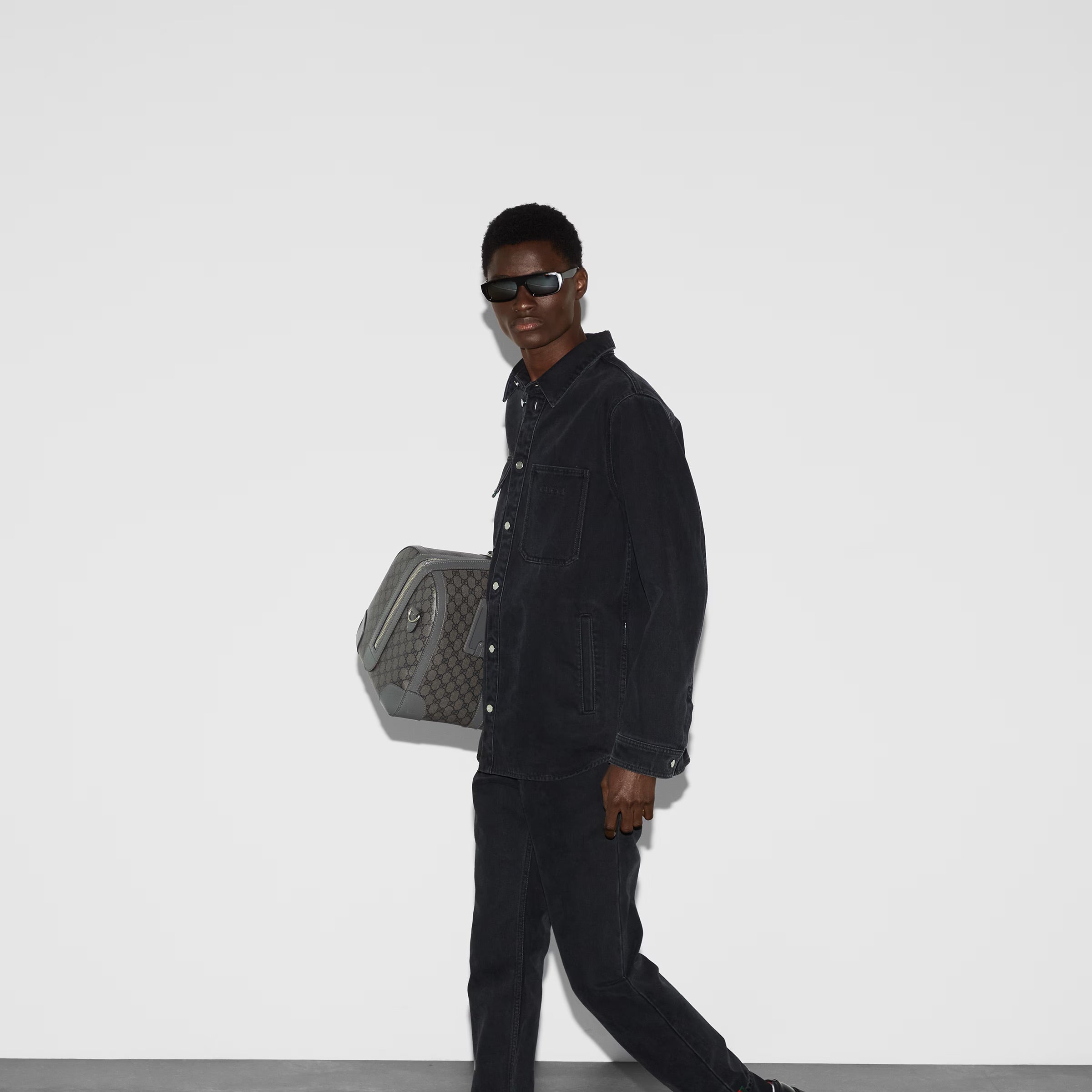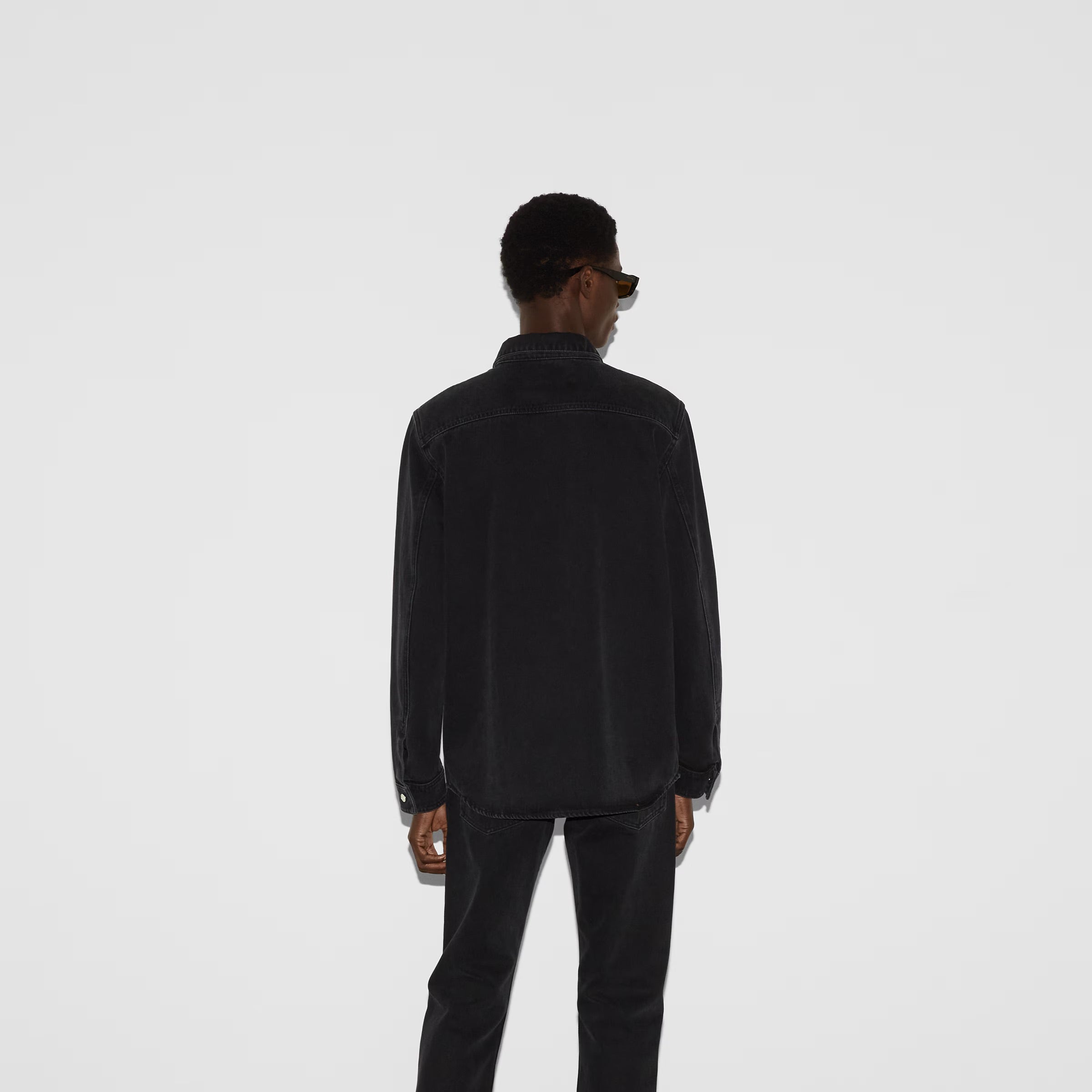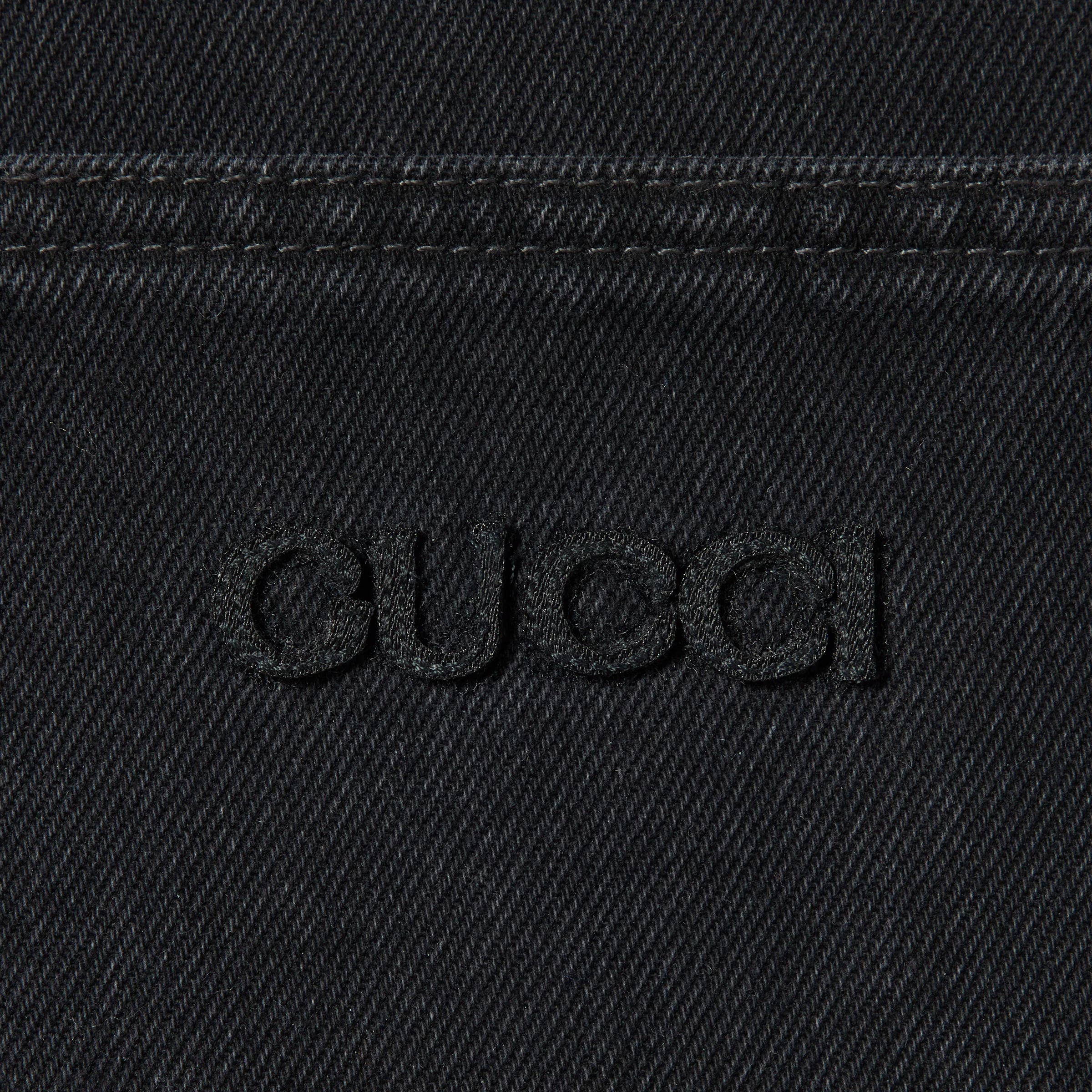 Darker color palettes usher in Pre-Fall mood with sophisticated sets that reveal complex internal constructions and subtle details behind a seemingly somber surface. This regular fit shirt is presented in a stone washed denim and enriched with a Gucci embroidery and a green and red Web loop detail.
