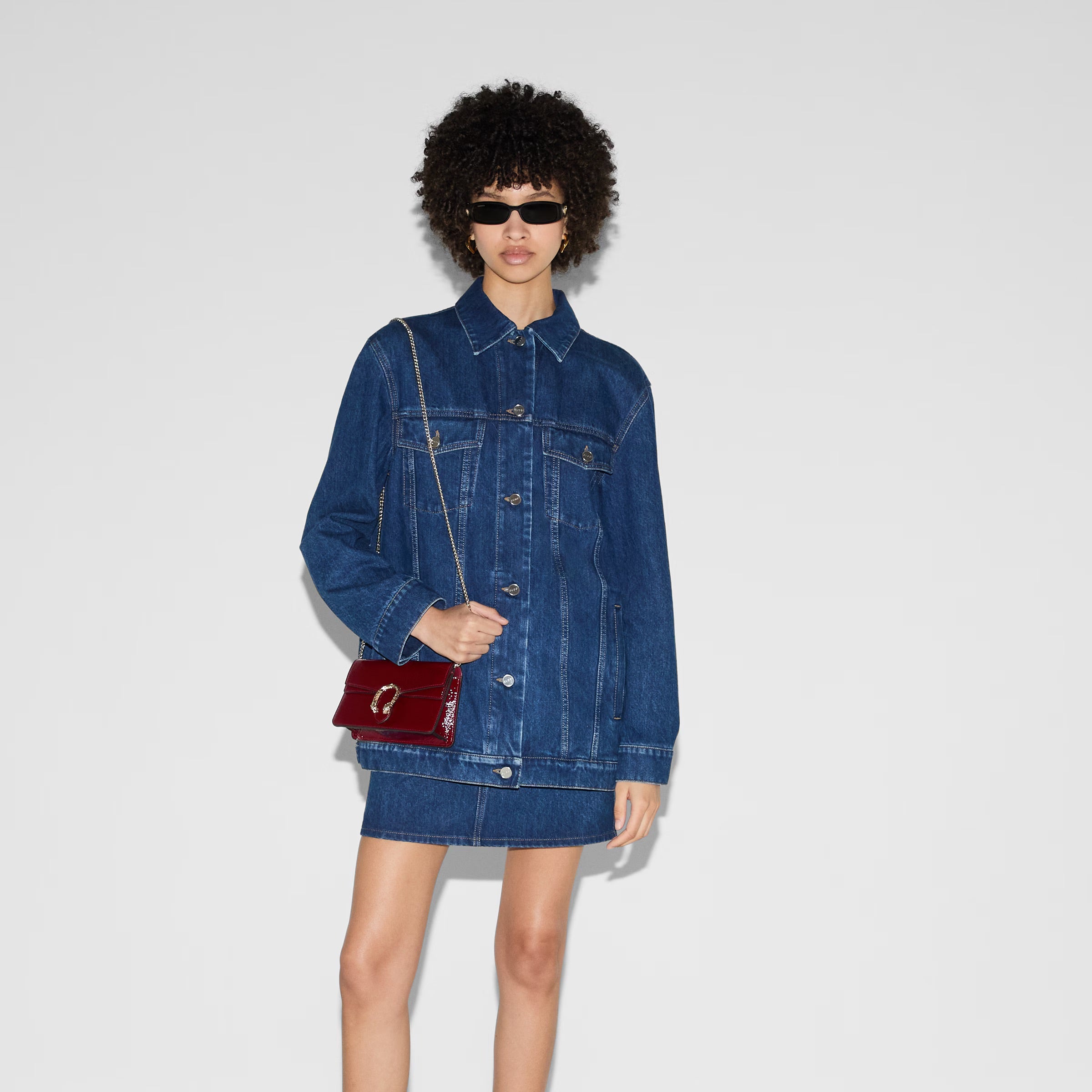 A shiny patent leather, in the signature Rosso Ancora shade of red, brings a fresh take to the Dionysus' well-structured design, while creating contrast with the signature tiger head hardware in a light gold tone. A suede leather lining completes the style with an elegant finish.