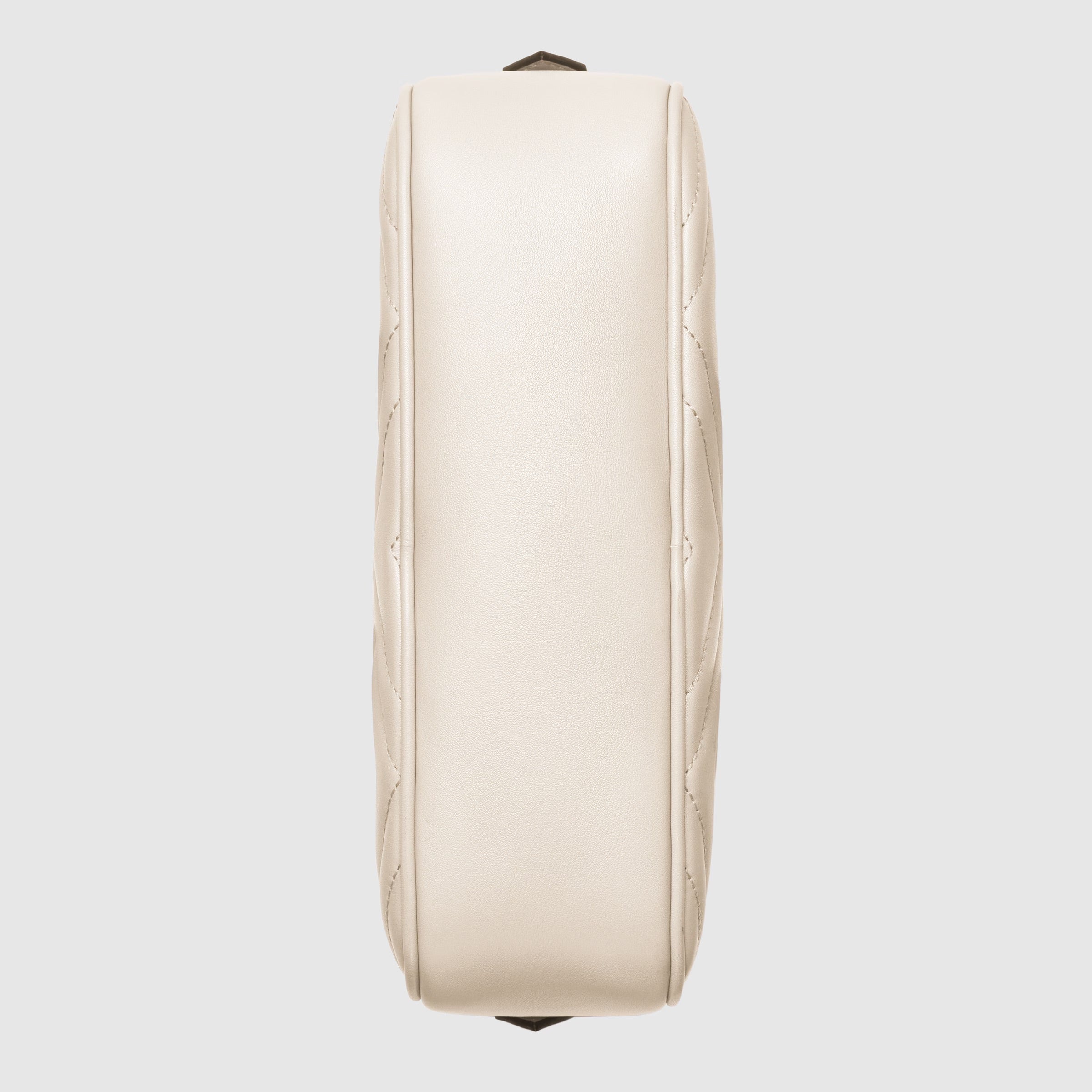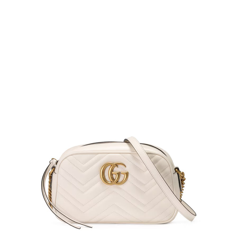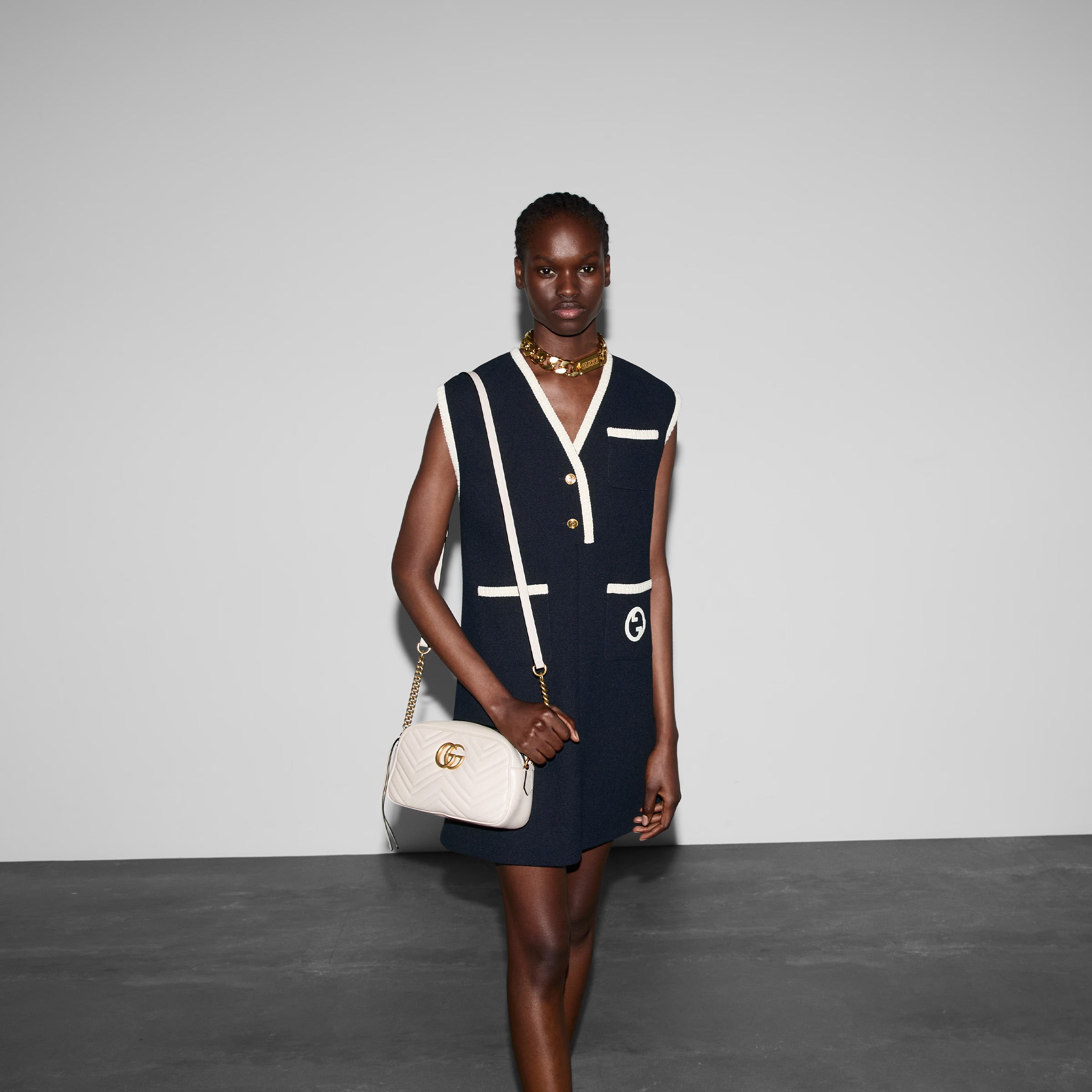 Inspired by the summer spirit and beach clubs on the Italian coast, this item is part of Gucci Lido. The GG Marmont small camera bag has a softly structured shape and a zip top closure with the Double G hardware. The chain shoulder strap has a leather shoulder detail. Made in matelassé leather with a chevron design and GG on the back.