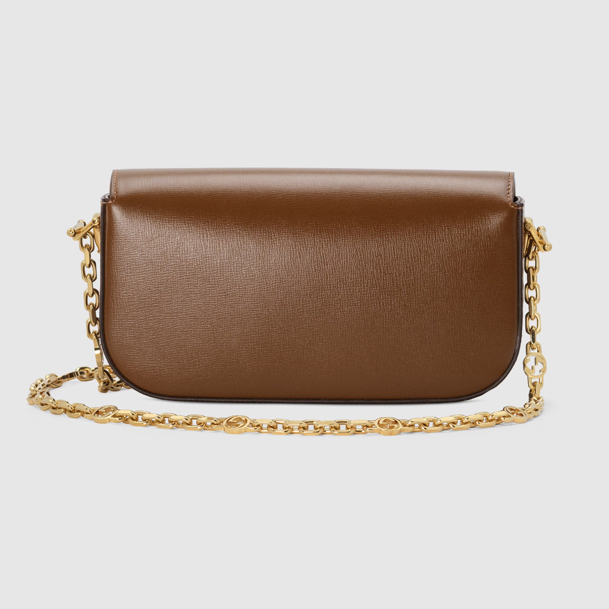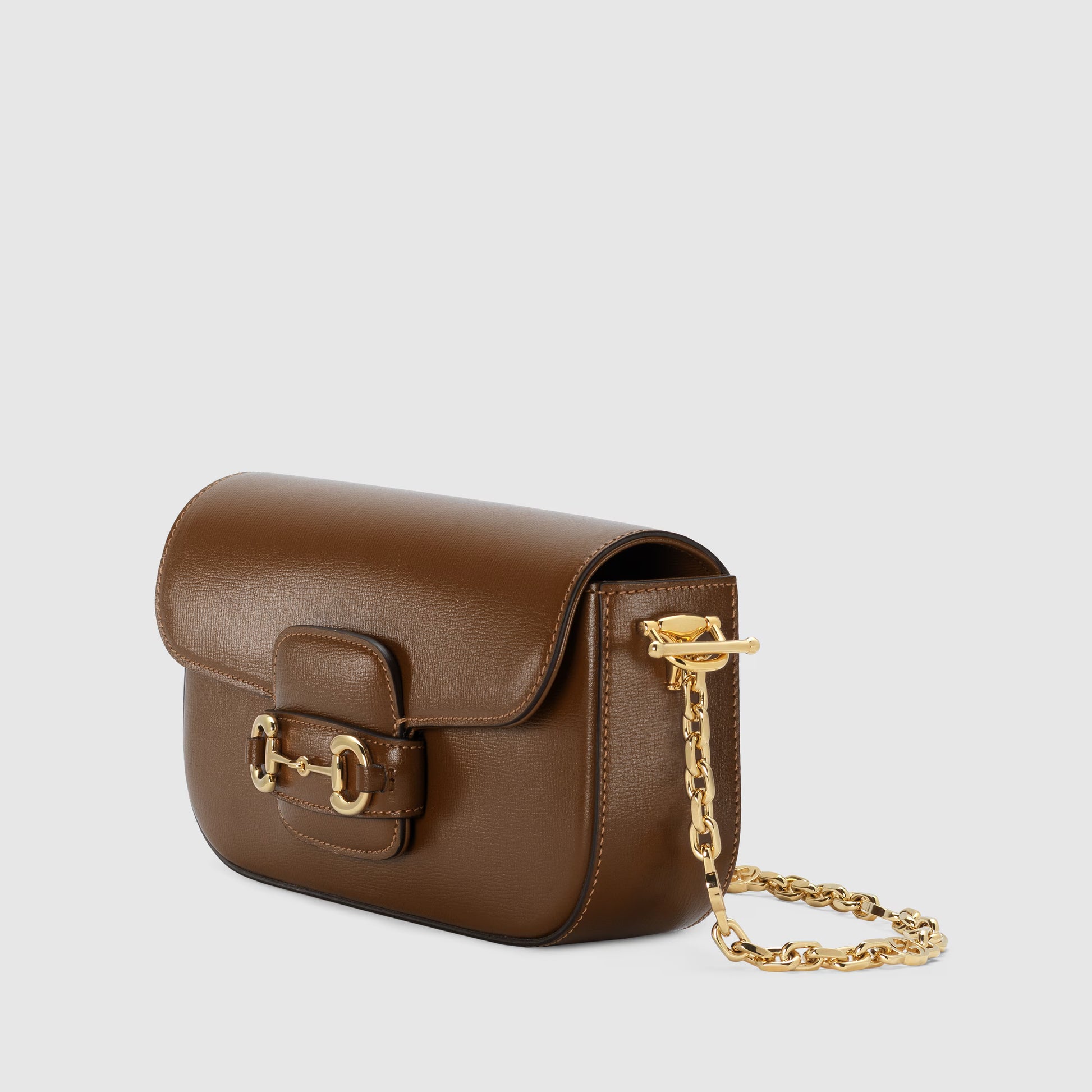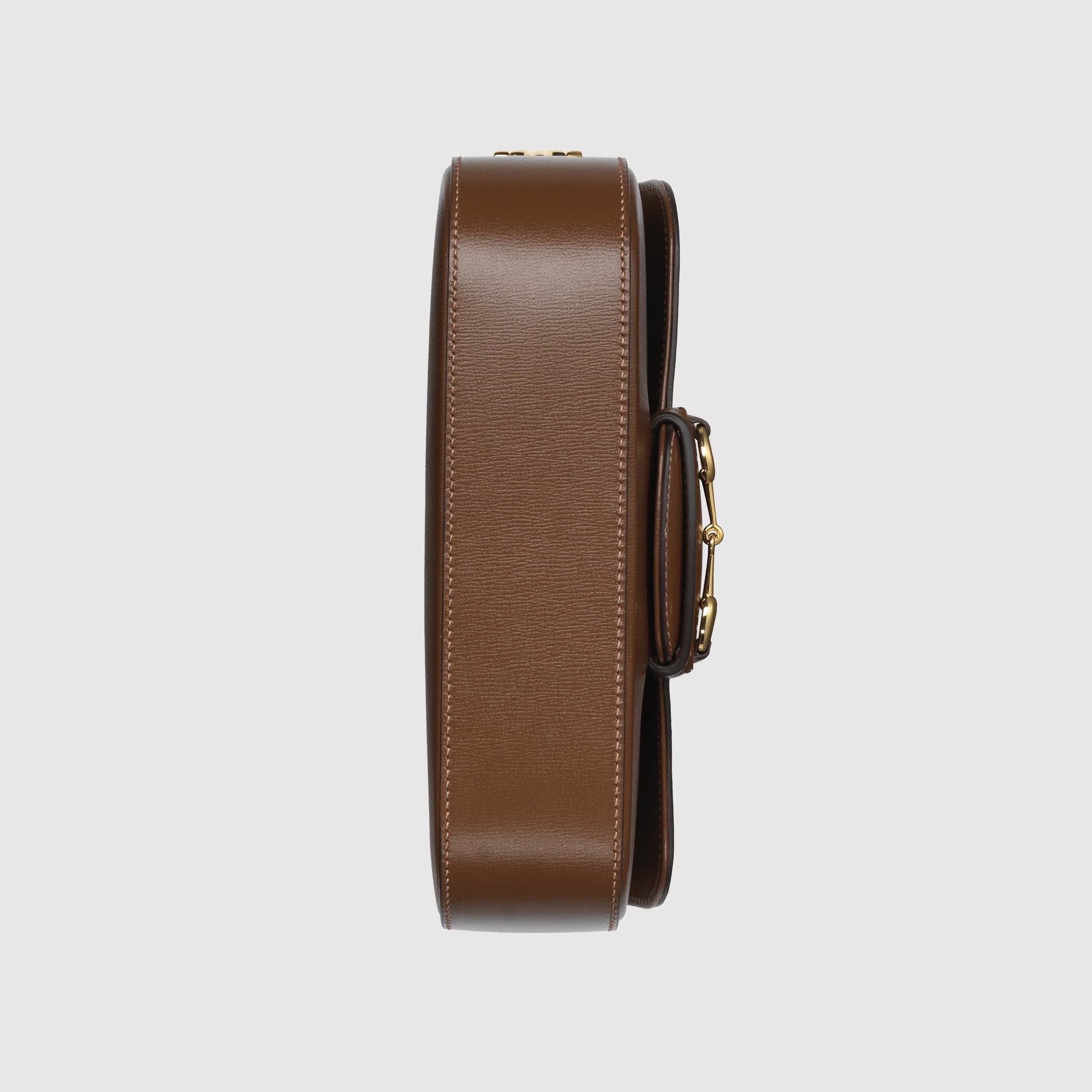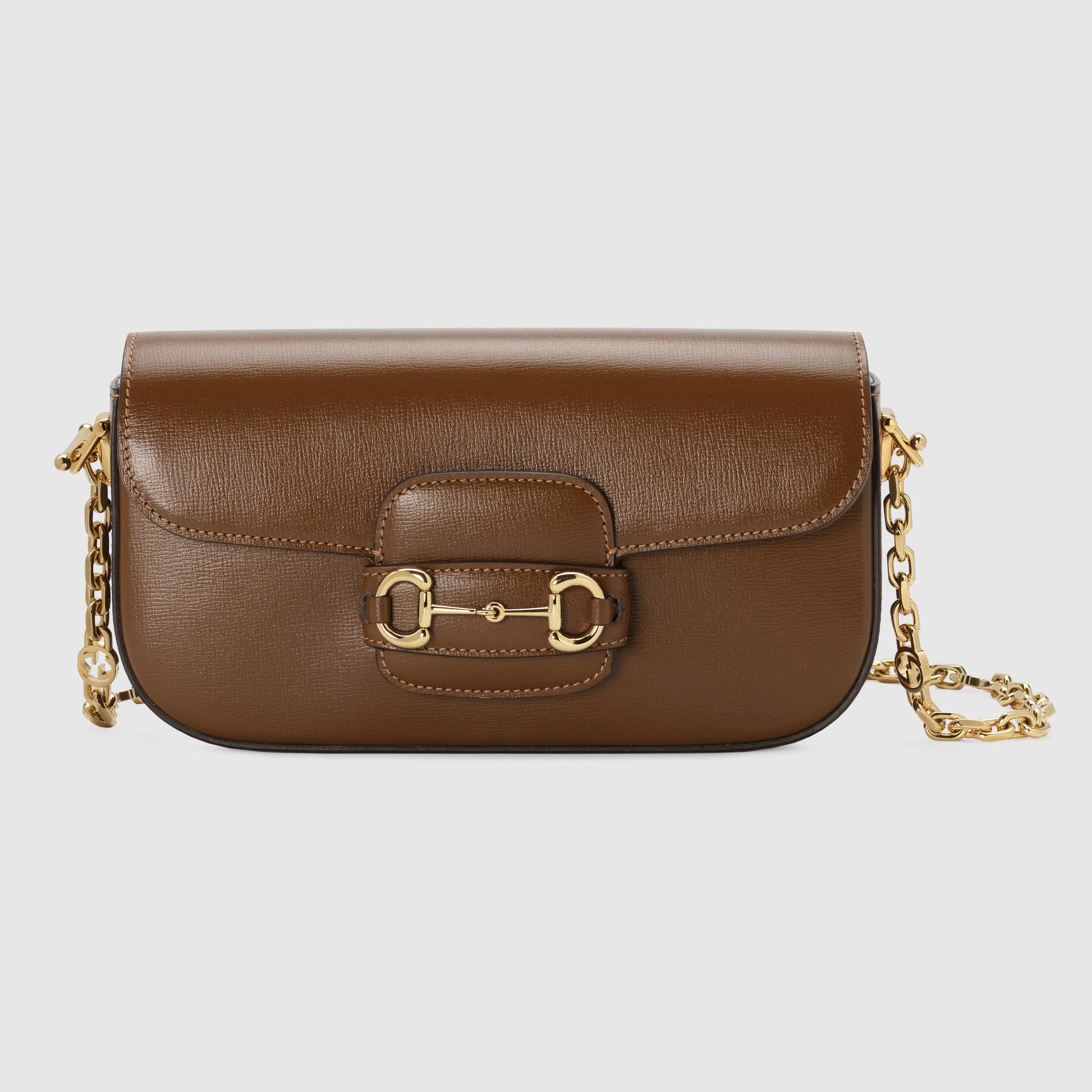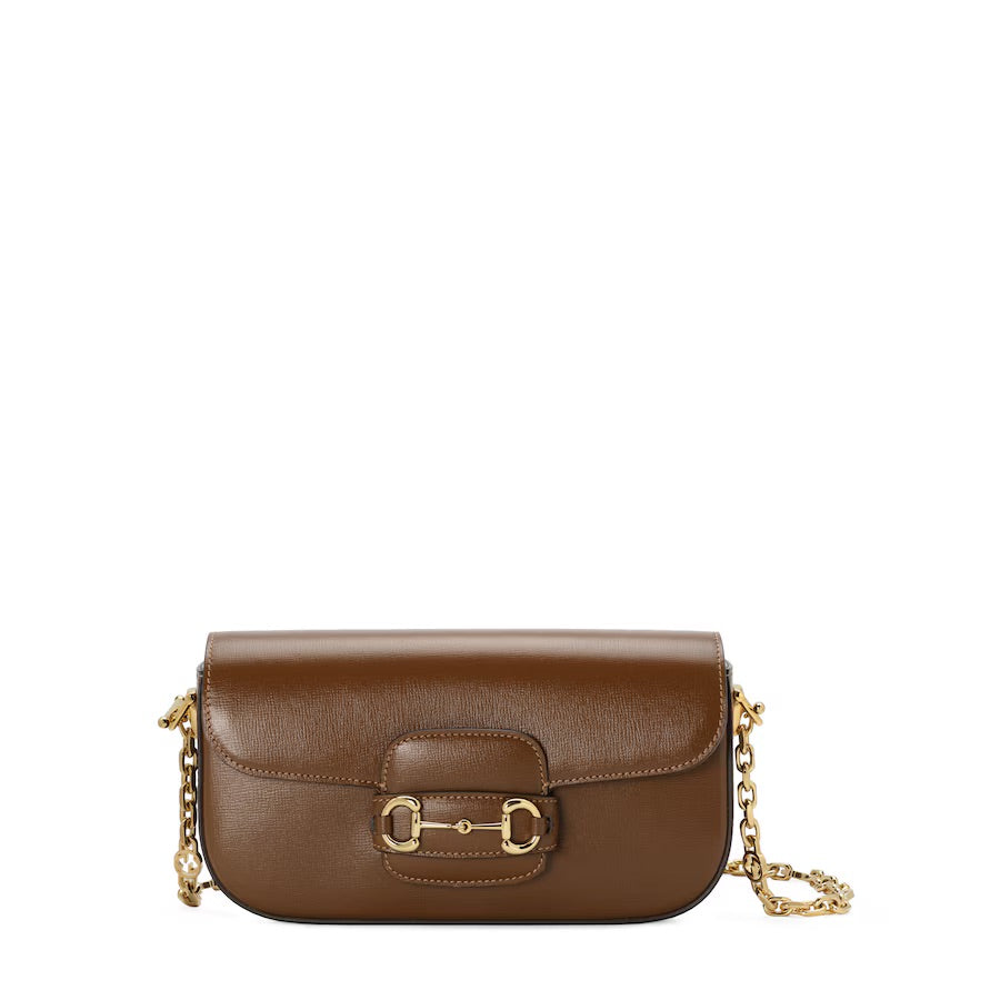 Rooted in the equestrian world, Gucci's heritage is rich in horse riding references. Subtle details such as the Horsebit continue to appear as decorative elements throughout the collections. Here, the iconic symbol highlights the smooth surface of this brown handbag, an evolution of the classic Gucci Horsebit 1955 shape.
