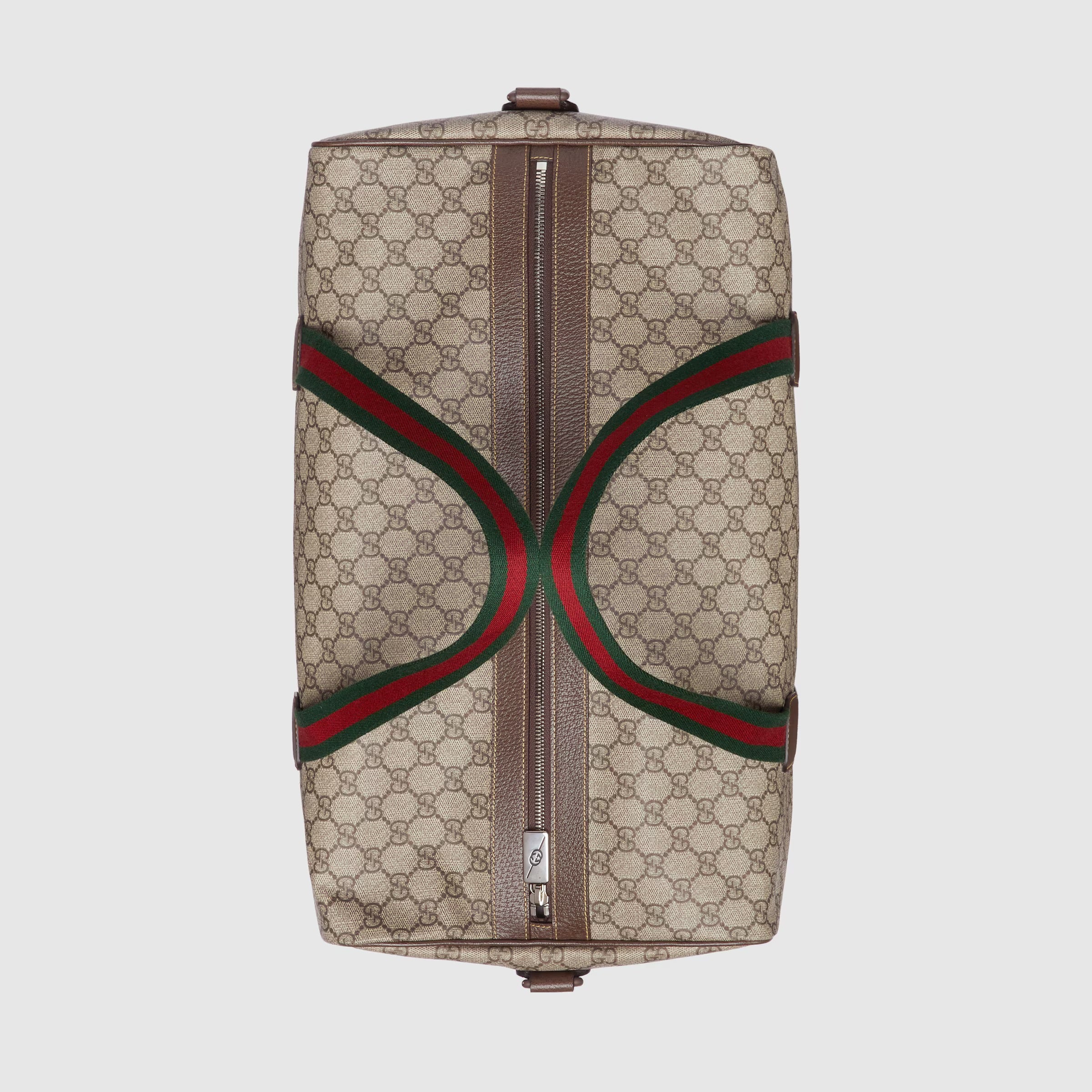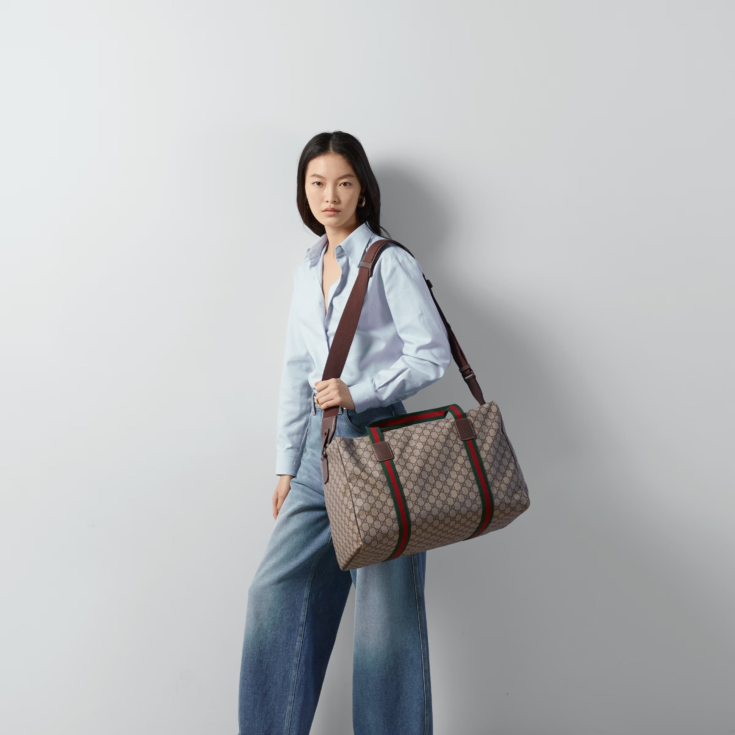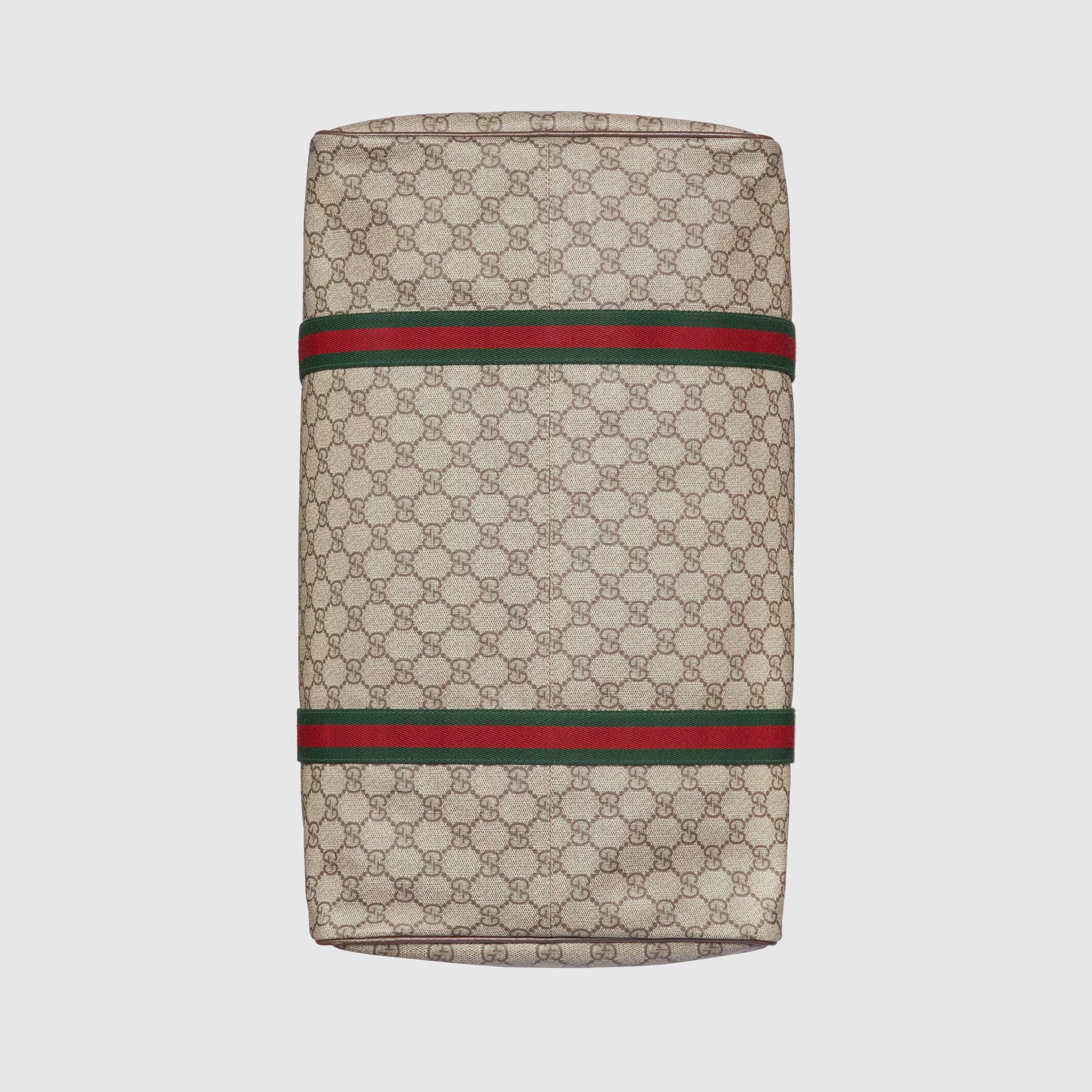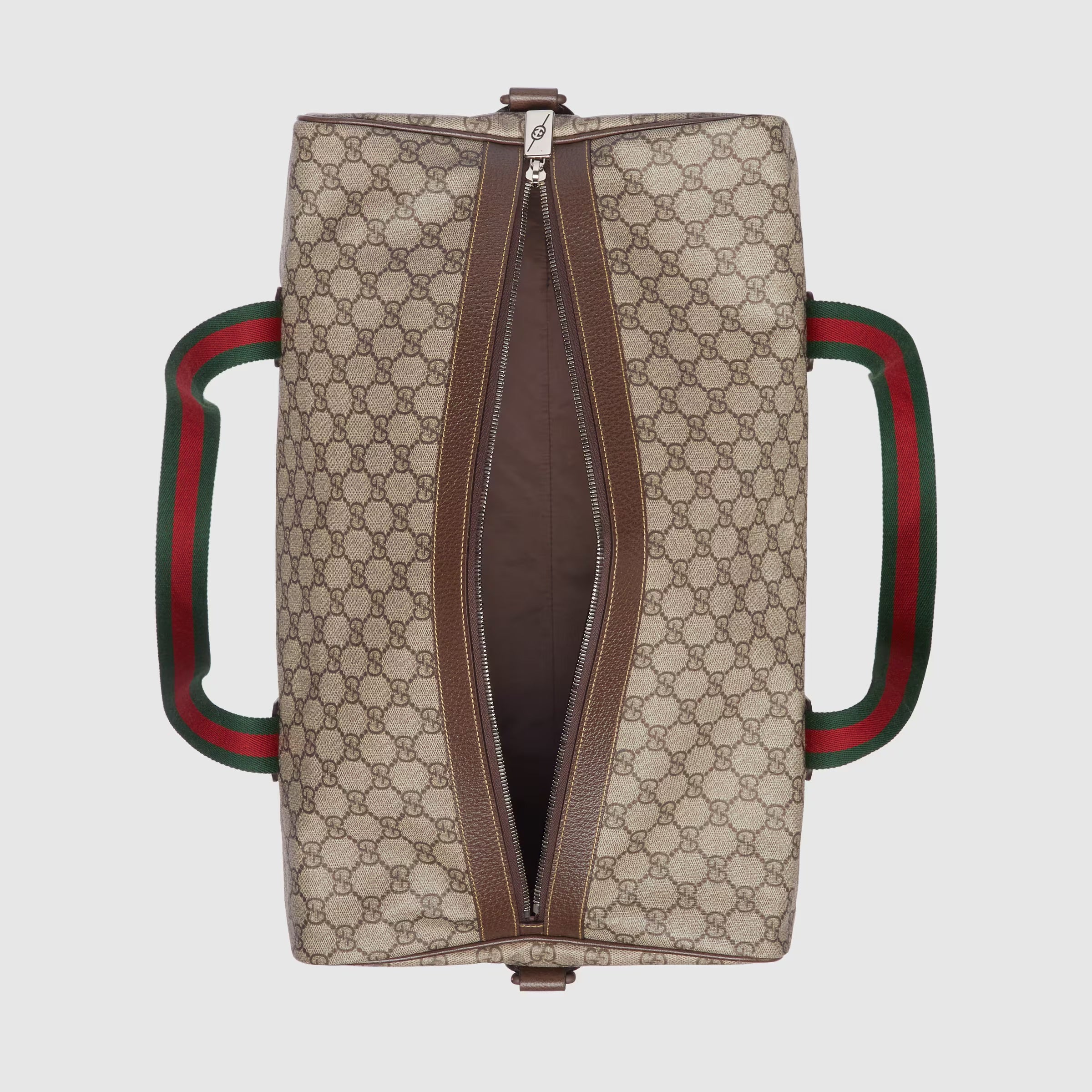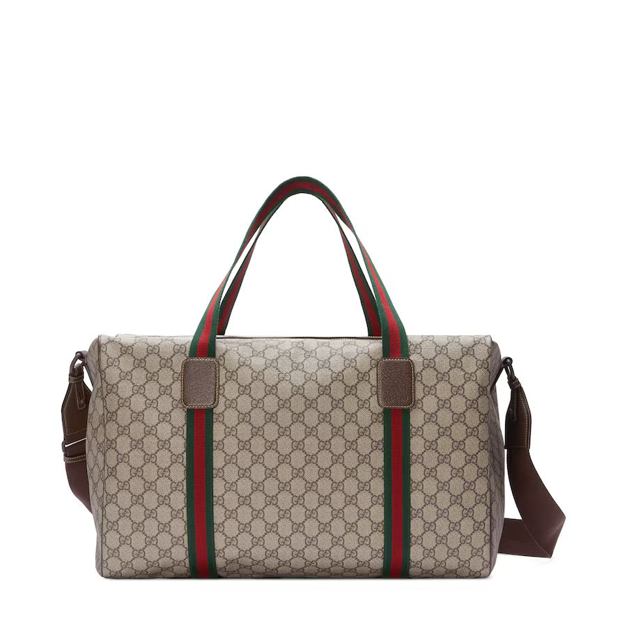 The GG Supreme is inspired by an archival design from the 1930s and remains one of the House's most emblematic materials. Here, the classic palette defines this duffle bag. A green d and red Web completes the travel piece.