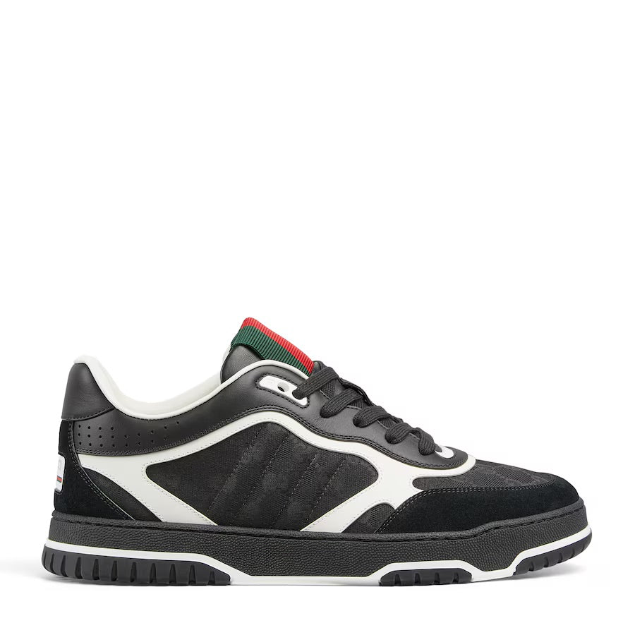 The Re-Web sees Gucci’s heritage stripes as a bold statement detail on a contemporary silhouette. Defined by iconic details, this pair of sneakers is crafted from black Original GG canvas and completed with green and red Web tongue.