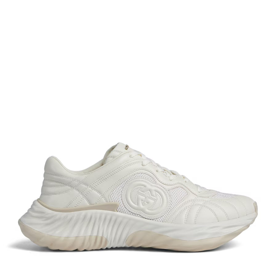 The Gucci Ripple sneaker features innovative stitching techniques which emulate the fluidity of water. The leather design is complete with three-dimensional elements which flow from the upper to the outsole, such as an Interlocking G leather patch with a 3D effect and a Gucci lettering metal hardware.