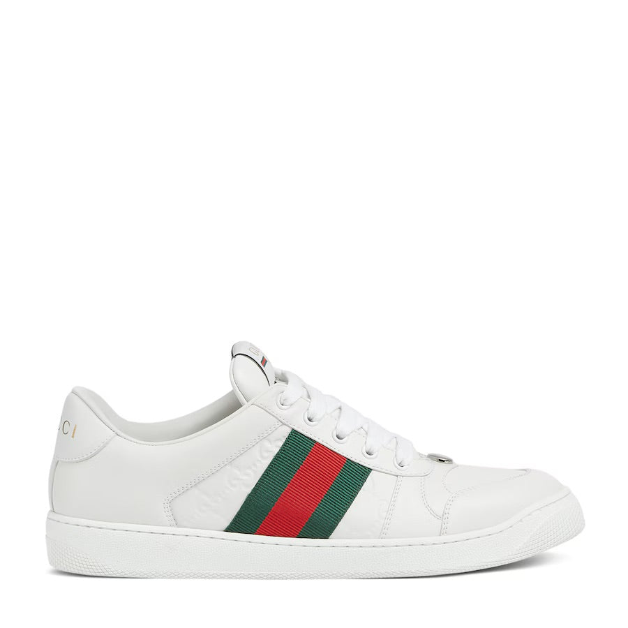 Influenced by classic sneakers from the 1970s, the Screener sneaker is named for the defensive sports move. Here the emblematic style is presented in white leather with an embossed GG leather insert