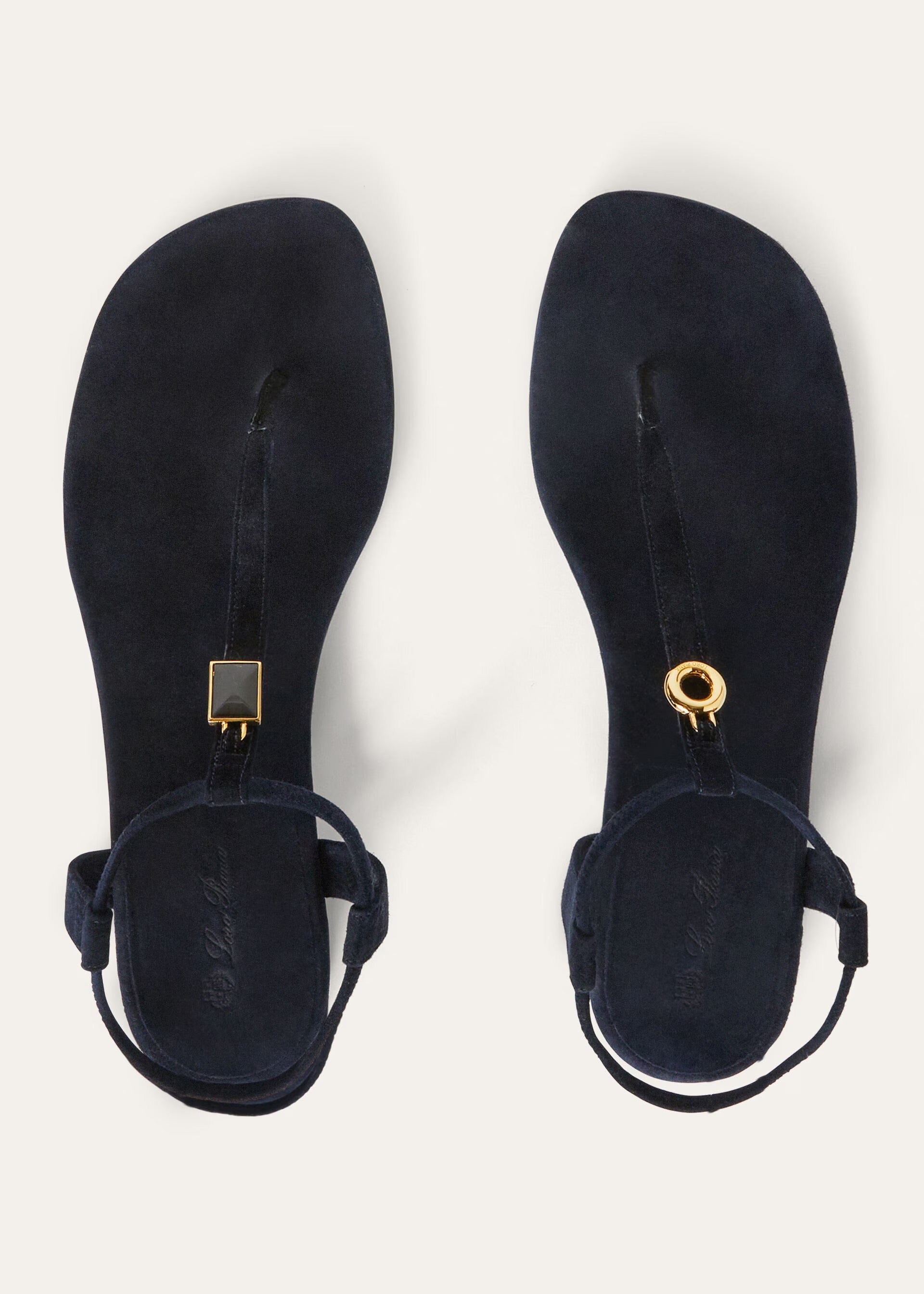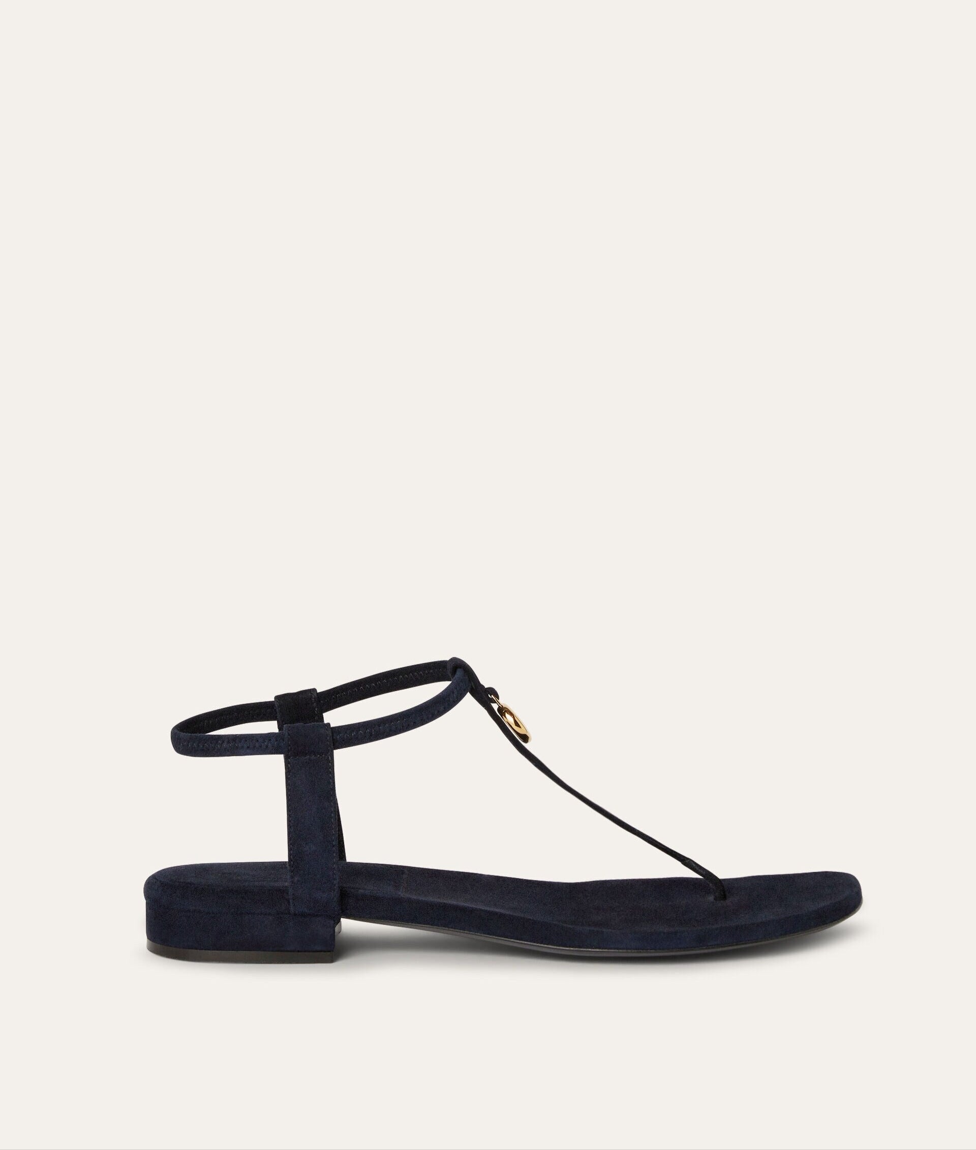 Soft kidskin forms the delicate, finely cut straps that meet at the top of the foot, where they are held in place by sturdy, elasticated ankles. One foot features a discreet horn padlock, while the other is adorned with a golden circle emblem. Despite their minimalist construction, these sandals exude refinement, making them the perfect companion for summer.
