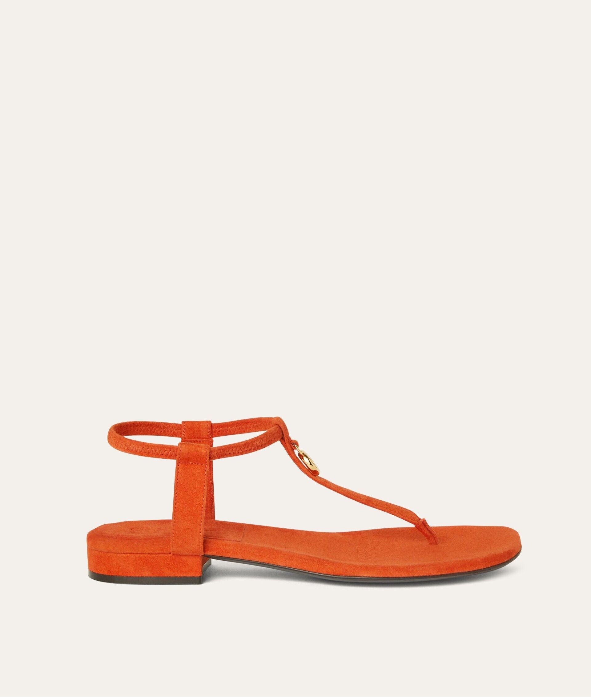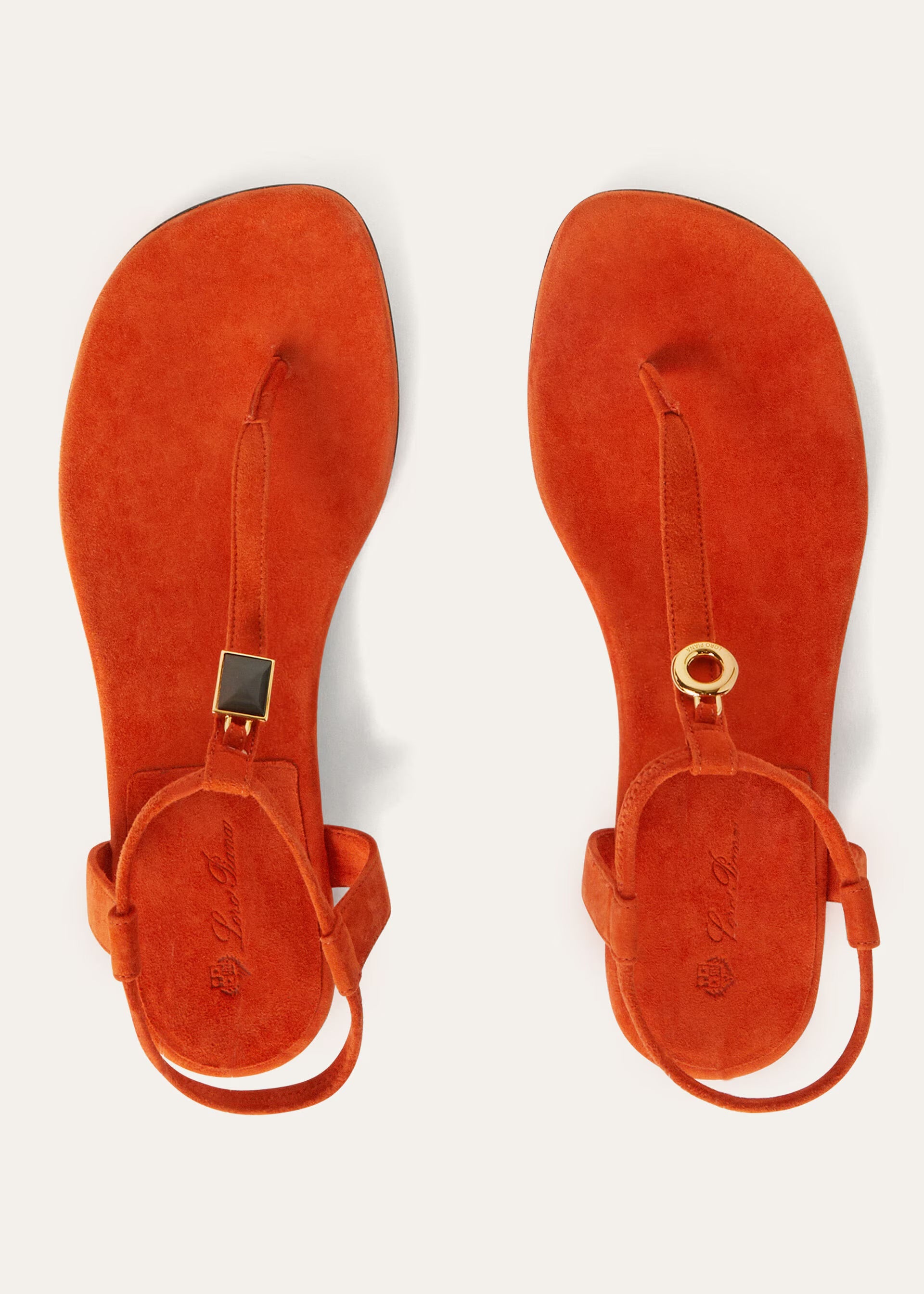 Soft kidskin forms the delicate, finely cut straps that meet at the top of the foot, where they are held in place by sturdy, elasticated ankles. One foot features a discreet horn padlock, while the other is adorned with a golden circle emblem. Despite their minimalist construction, these sandals exude refinement, making them the perfect companion for summer.