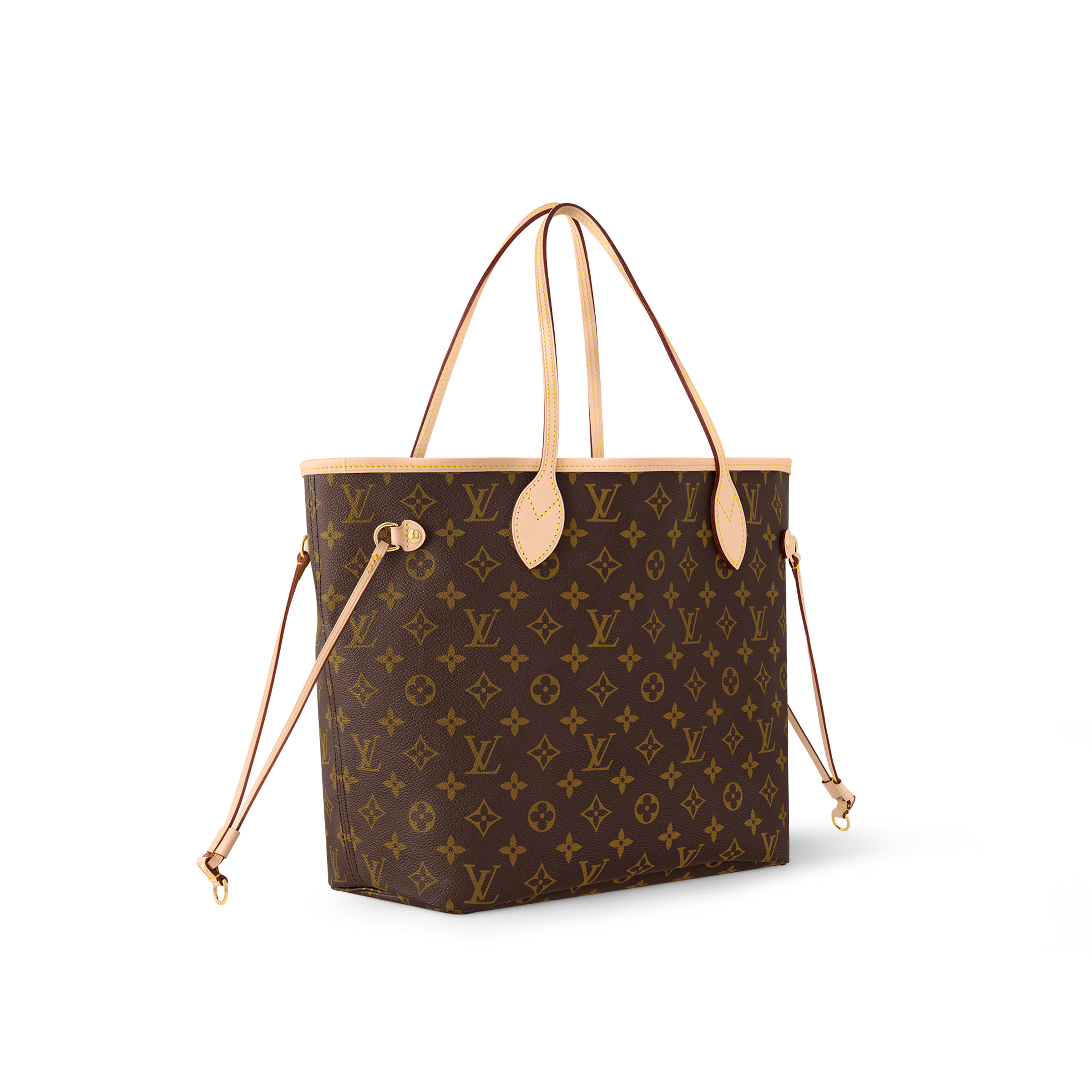 The Neverfull MM tote unites timeless design with heritage details. Made from supple Monogram canvas with natural cowhide trim, it is roomy yet not bulky, with side laces that cinch for a sleek allure or loosen for a casual look. Slim, comfortable handles slip easily over the shoulder or arm. Lined in colorful textile, it features a removable pouch which can be used as a clutch or an extra pocket.