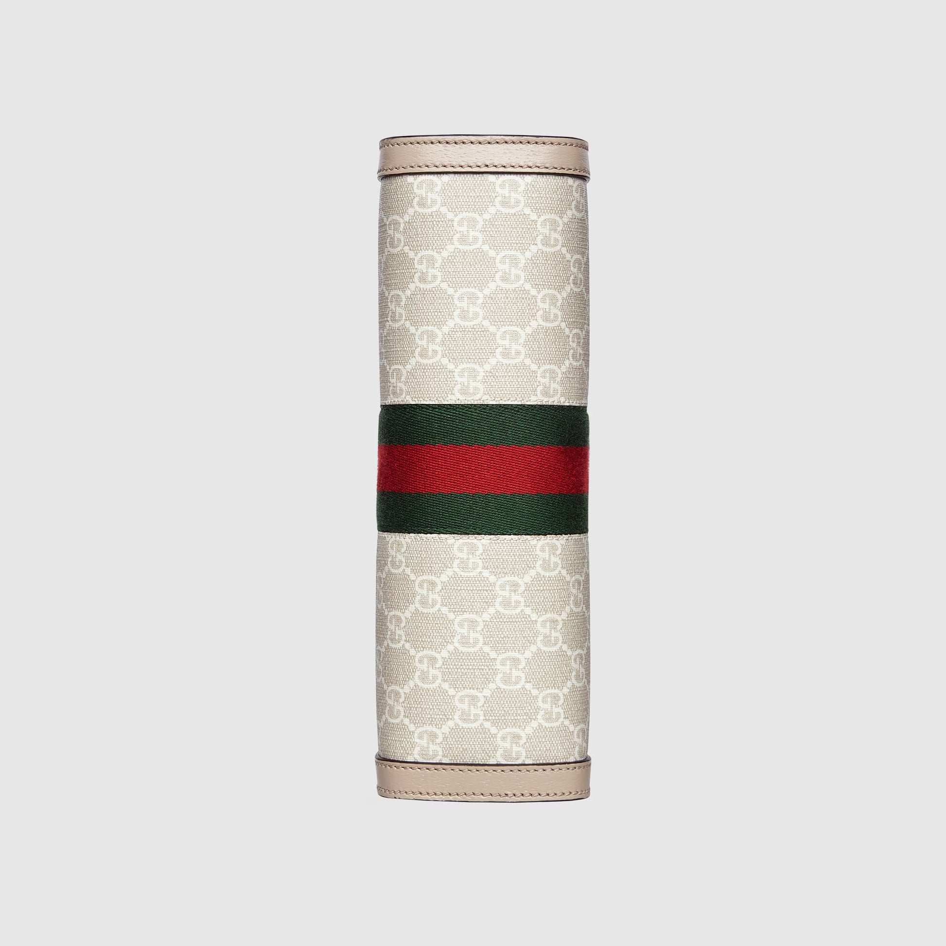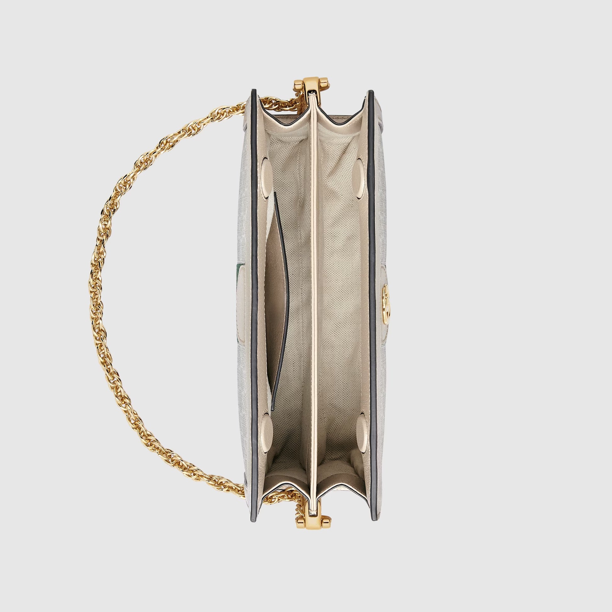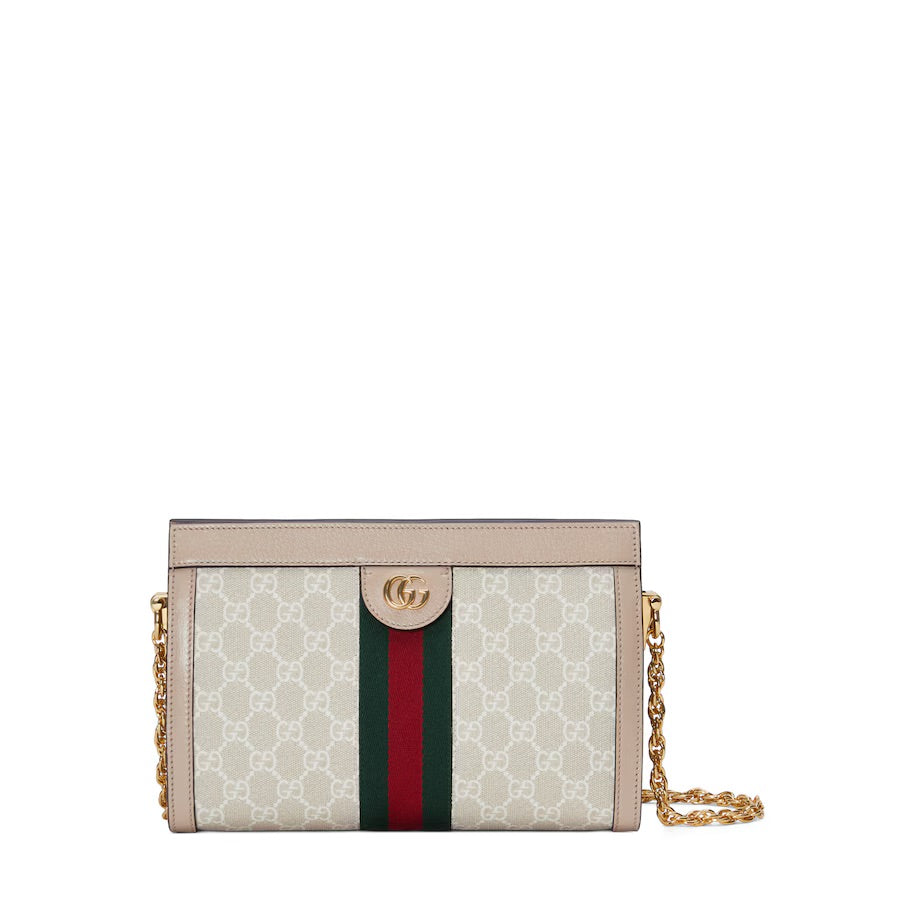 A heritage material from the archive, GG Supreme has been reimagined in Gucci Love Parade in different color combinations and combined with contemporary as well as classic styles. The Ophidia shoulder bag is presented in a beige and white variation of the signature material with a tonal trim. Originally a play on a '30s design, the material speaks to the historical narrative that runs throughout the collection.