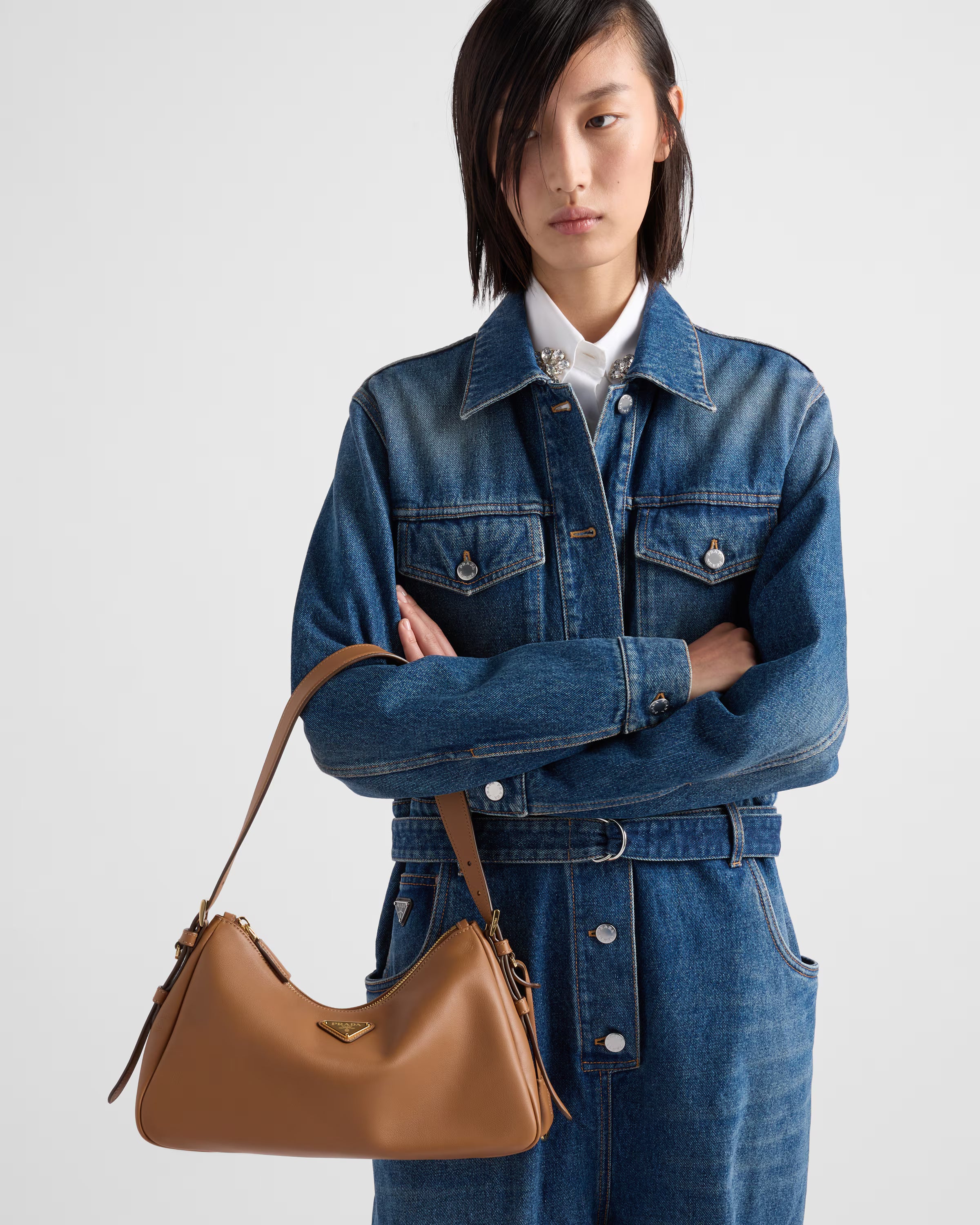 The sophisticated minimalism of the '90s inspires the new Prada Aimée bag. The design evokes the instinctive gesture of holding a bag with its soft silhouette, created for effortless wear on the shoulders or cross-body.